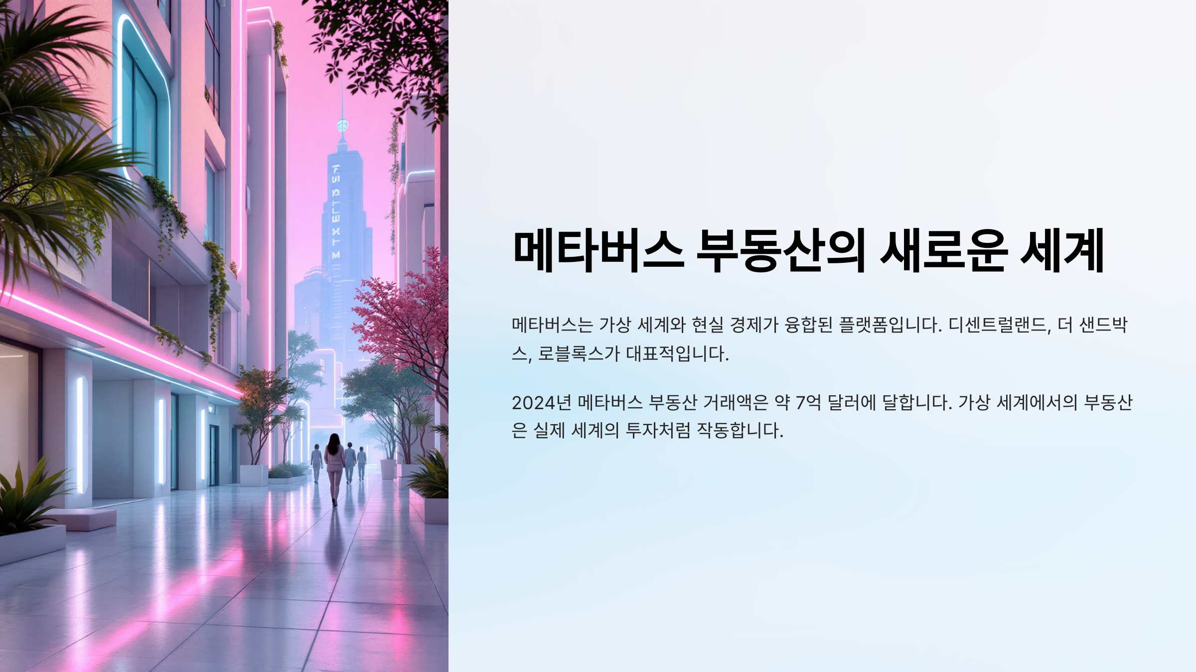 특히 '디센트럴랜드', '더 샌드박스', '어스2' 같은 플랫폼에서는 이미 수십억 원 대의 거래가 이뤄지고 있어요. 가상 공간이지만 현실 못지않은 가치가 붙으면서, 부동산 시장의 패러다임이 완전히 달라지고 있는 느낌이에요. 그래서 오늘은 메타버스 부동산에 대해 제대로 알아보려 해요. 함께 출발해 볼까요? 🚀