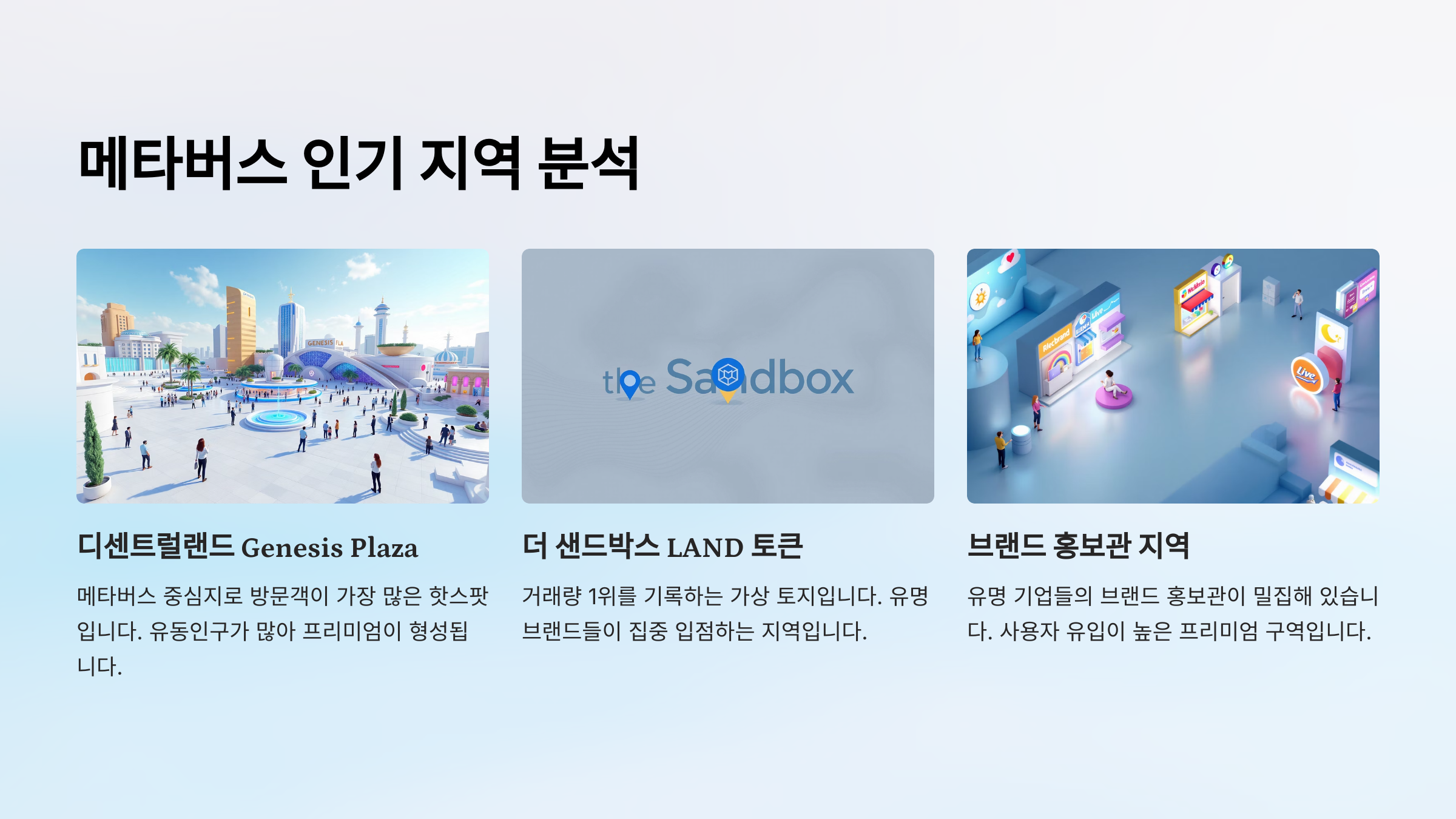 | 디센트럴랜드 | Genesis Plaza | 중심지, 유동인구 많음 | 이벤트 광고 효과 기대 |