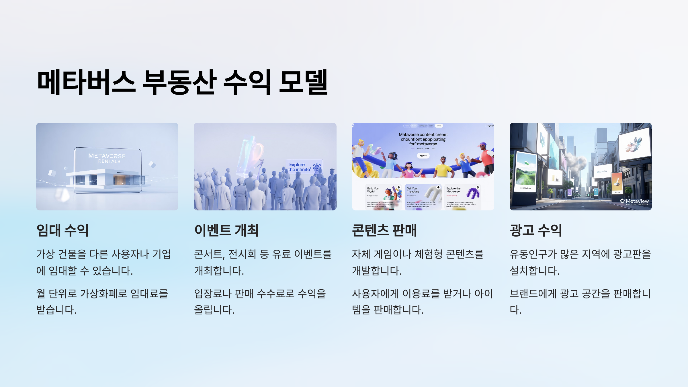 내가 생각했을 때, 앞으로는 메타버스 부동산이 단순한 투자를 넘어서, 비즈니스와 소셜 활동의 중심지 역할도 하게 될 것 같아요. 그래서 미리 공부하고 준비하는 게 정말 중요하다고 느껴요.
