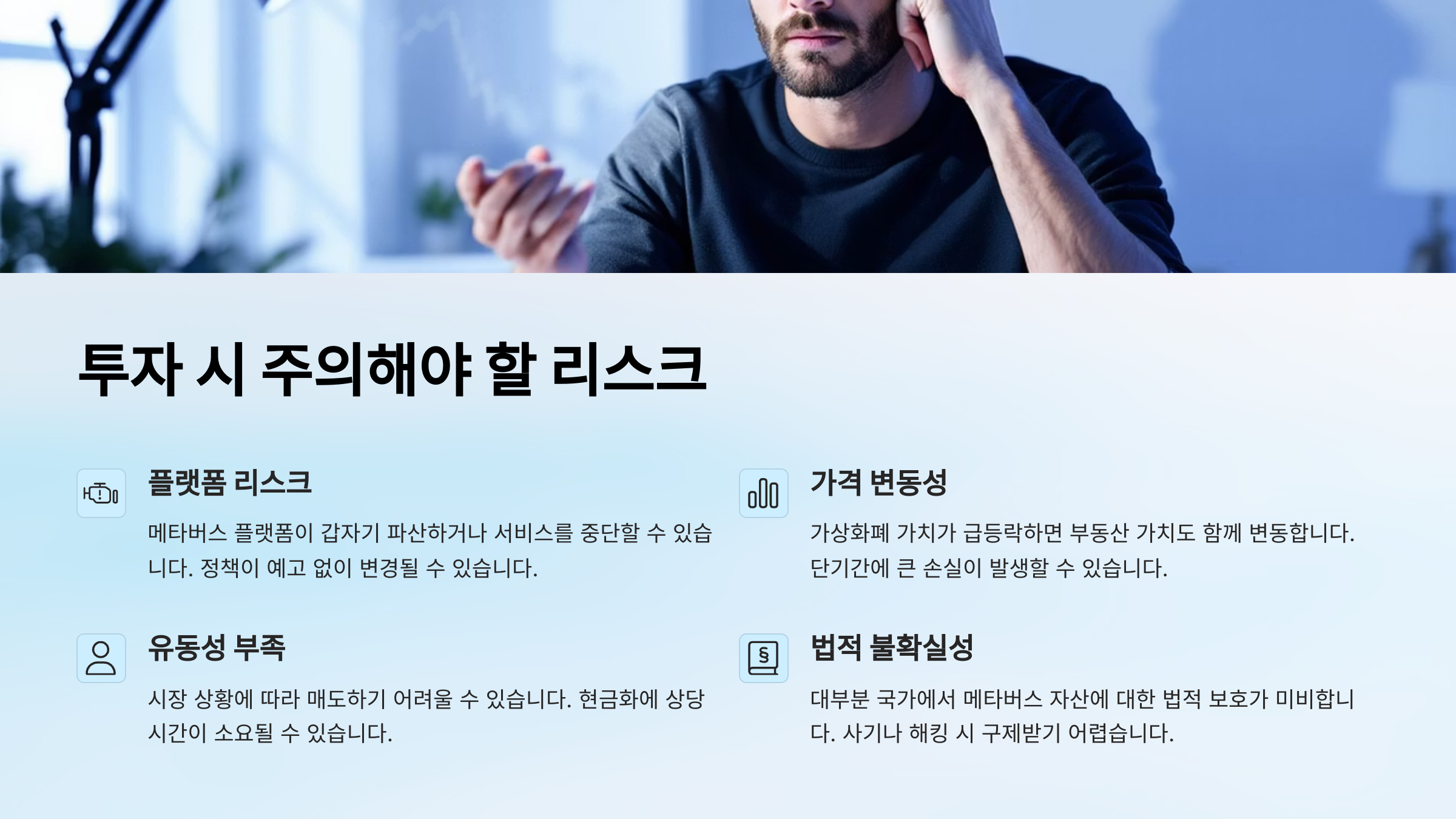 두 번째 위험은 플랫폼 리스크에요. 만약 투자한 메타버스 플랫폼이 인기를 잃거나 사업을 접게 된다면, 그 안의 부동산 가치도 급격히 하락할 수 있어요. 분산 투자하거나 검증된 플랫폼을 선택하는 것이 중요해요.