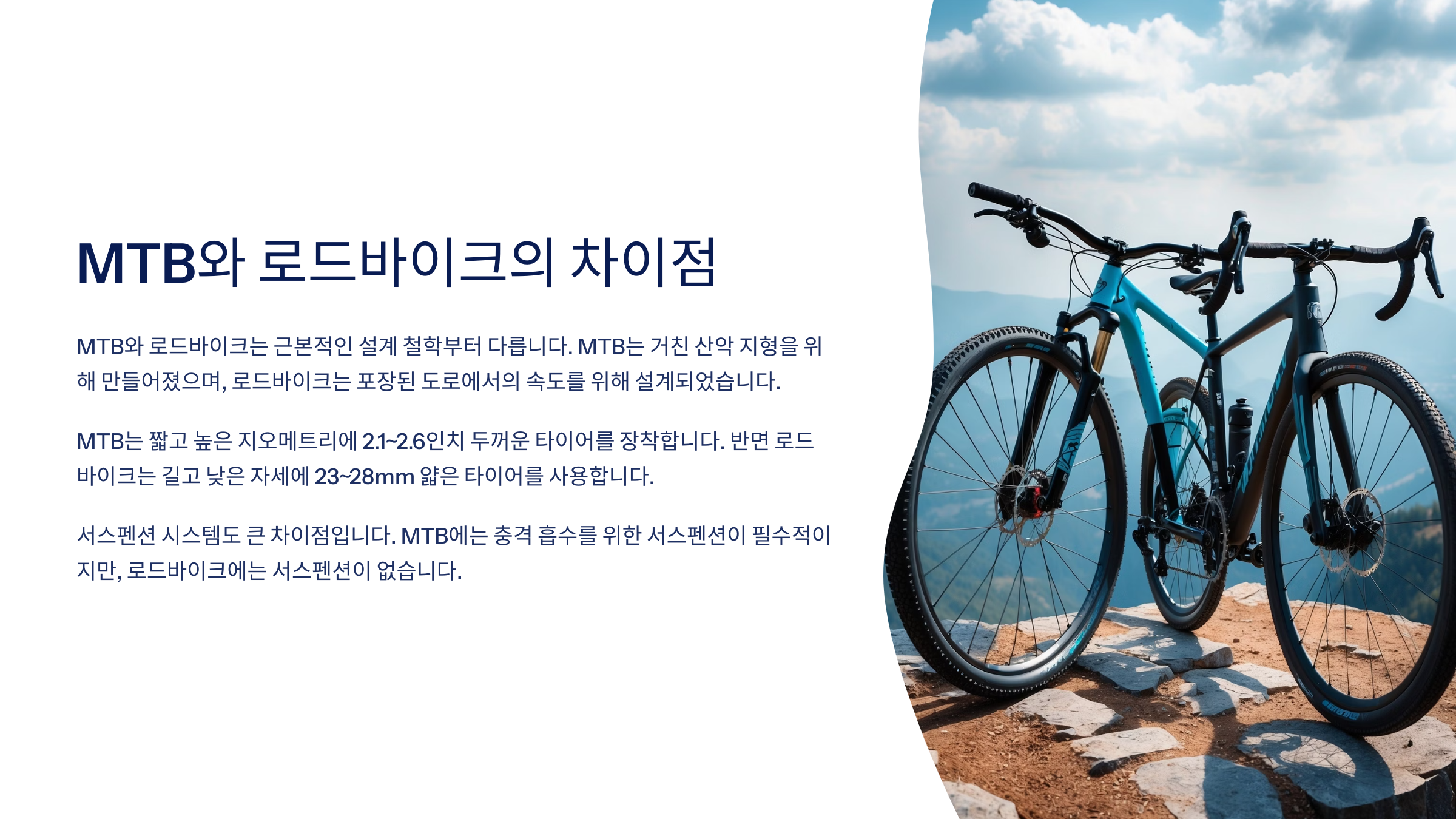 MTB와 로드바이크는 목적이 완전히 달라요. 로드는 포장된 길을 빠르게 달리기 위한 자전거고, MTB는 험한 길, 산악 지형을 오르내리는 데 특화되어 있죠.