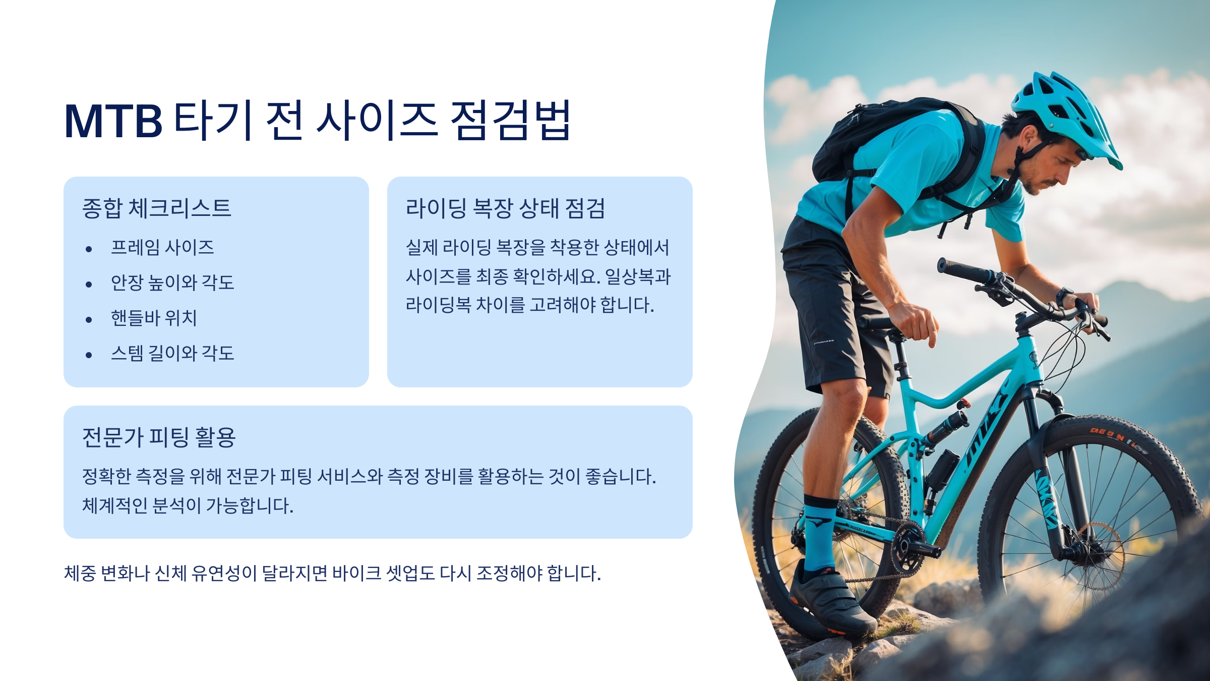 이 네 가지를 체크하면 MTB 타기 전에 거의 모든 사이즈 실수를 예방할 수 있어요. 🚵♂️