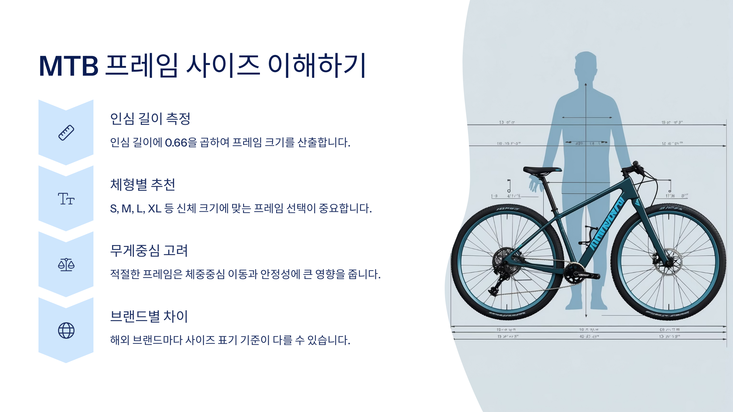 MTB는 작은 사이즈를 타도 핸들링이 좋아서 오히려 라이딩 실력이 잘 살아나요. 너무 큰 프레임은 스트레스만 키울 뿐이에요. 몸에 맞게 정확히 고르는 게 핵심!