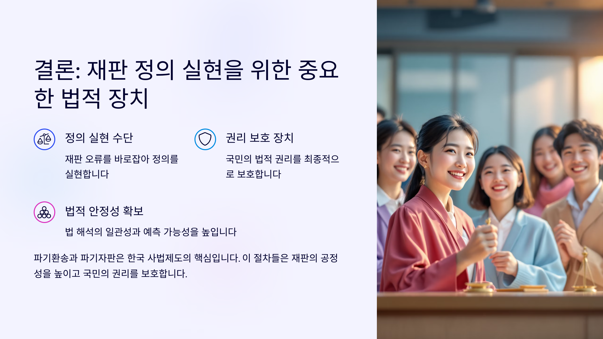 지금까지 파기환송과 파기자판의 차이를 자세히 살펴봤어요. 두 절차 모두 대법원이 기존 판결에 문제가 있다고 판단할 때 쓰이는 방법이지만, 그 처리 방식은 완전히 달라요.