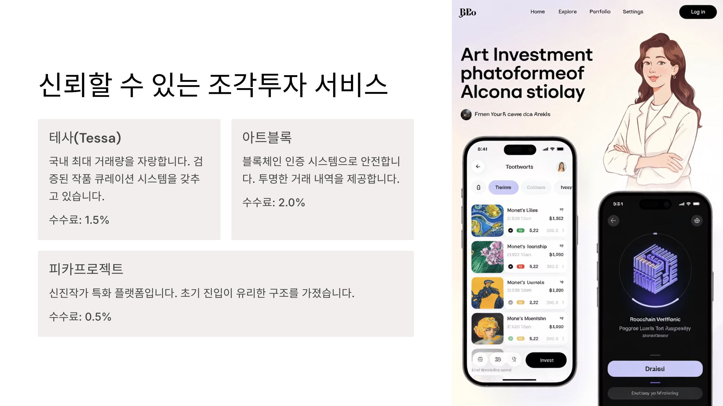 좋은 플랫폼을 고르는 기준은 다음과 같아요. 감정과 보관 시스템의 투명성, 작품 큐레이션의 전문성, 수익 분배 방식, 그리고 2차 거래소의 유무. 특히 2차 거래소가 잘 운영되는 플랫폼은 유동성 면에서 큰 장점이 있답니다.