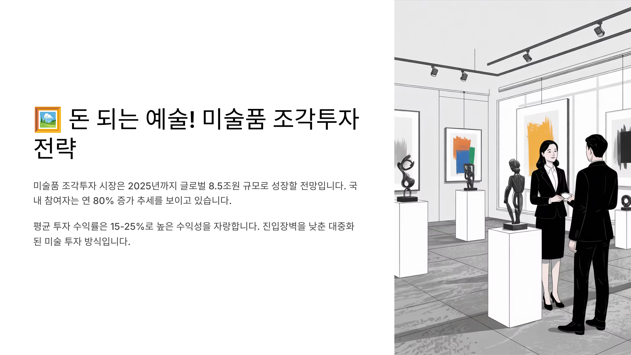 🖼️ “예술은 돈이 된다”는 말, 이제는 단순한 표현이 아니에요. 수천만 원, 수억 원을 호가하는 미술품들이 실제로 투자 수단으로 주목받고 있고, 조각투자를 통해 일반인도 이 세계에 참여할 수 있는 길이 열렸어요. 기존의 미술 투자가 자산가들의 전유물이었던 시절은 지났답니다.