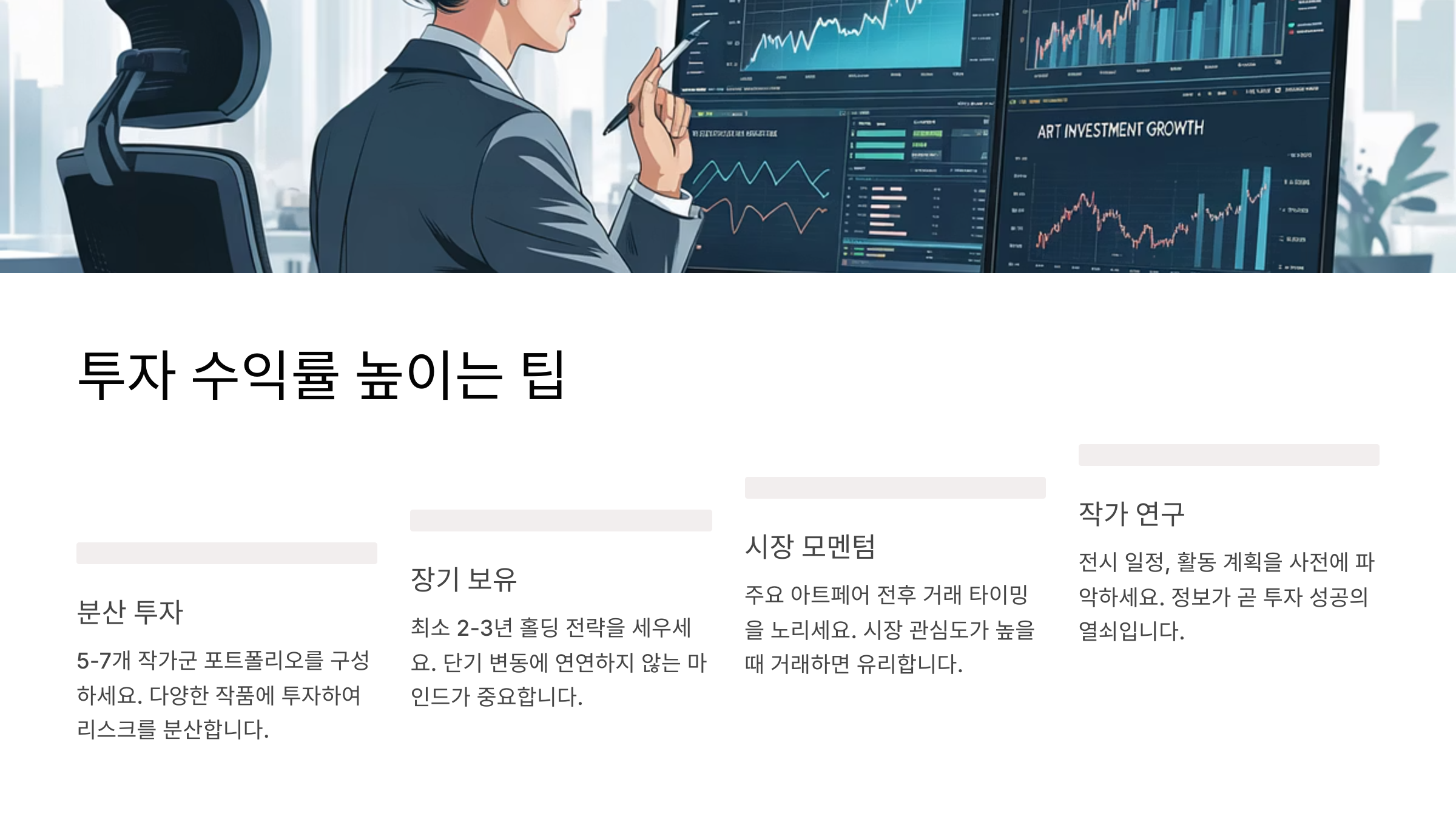 | 작가 포트폴리오 분산 | 블루칩 + 신진 작가 혼합 | 수익 안정성 + 성장성 확보 |