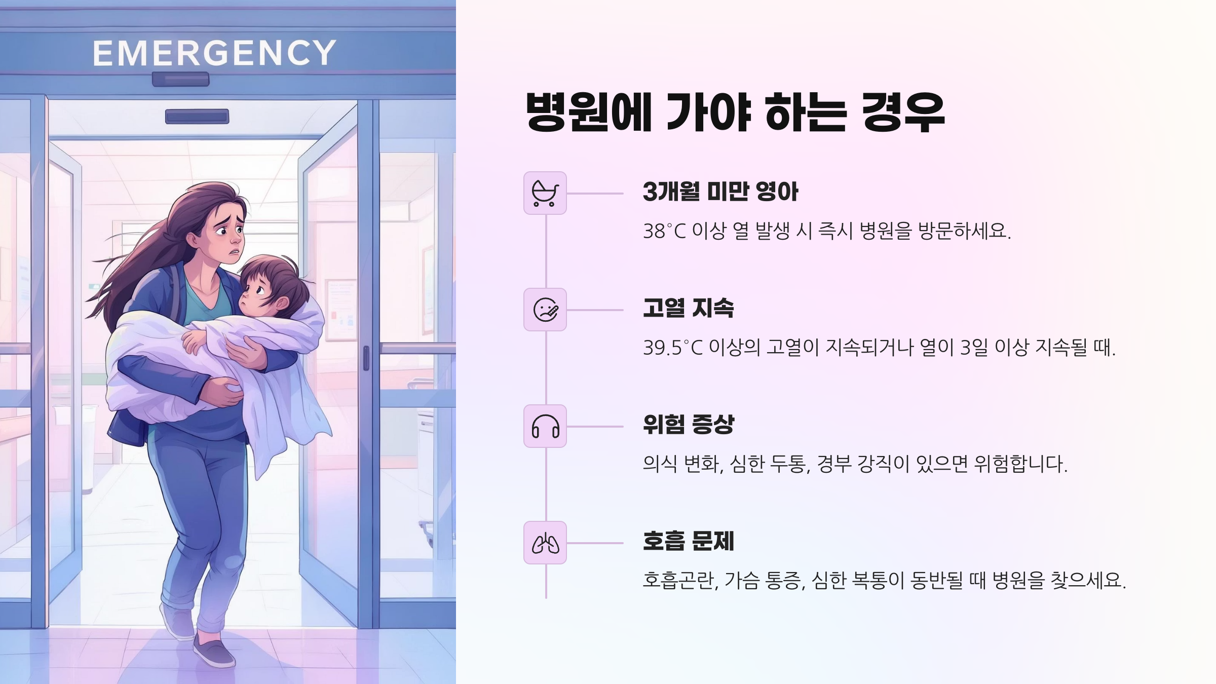 고열은 때로는 몸의 방어 반응이지만, 상황에 따라선 위험한 신호일 수도 있어요. 병원에 가야 하는 타이밍을 놓치지 않도록 위의 상황을 꼭 기억해두세요. 다음은 아이가 고열일 때의 대처법을 알려드릴게요!