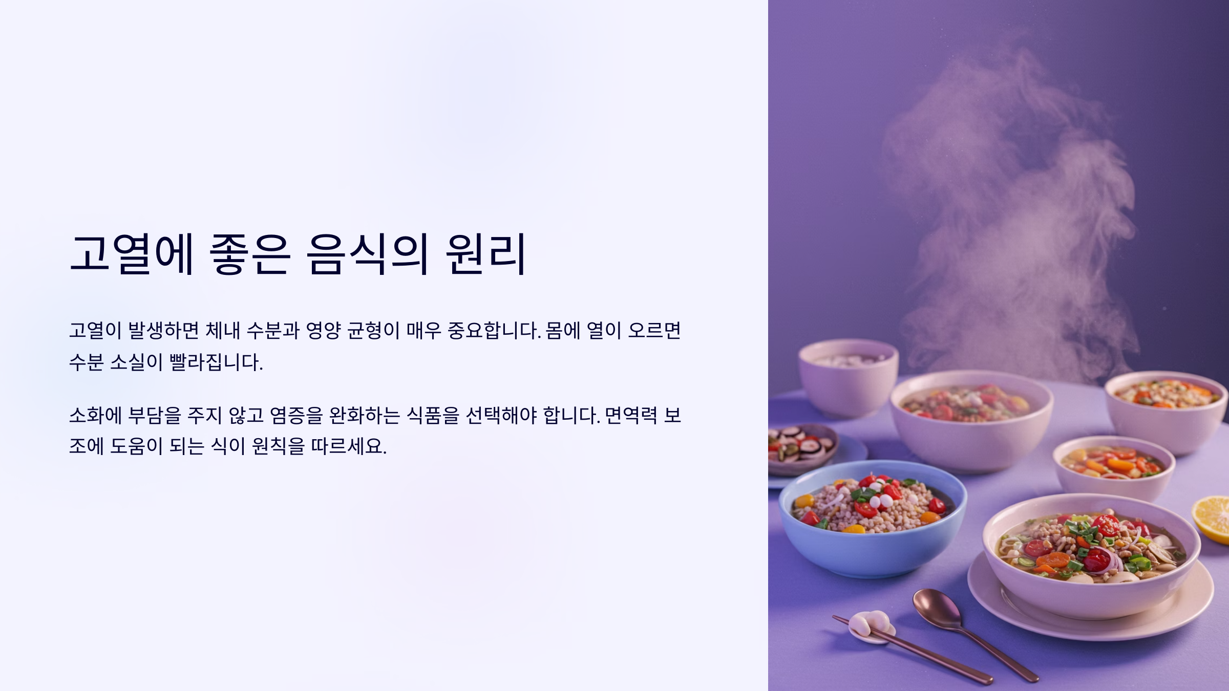 고열이 있을 때는 위장이 예민해지고 소화 기능이 떨어지기 쉬워요. 이럴 때는 자극이 없고 부드러워서 흡수가 잘 되는 음식을 먹는 게 좋아요. 음식 자체가 에너지 소모를 적게 하면서도 영양은 충분히 공급돼야 하니까요.