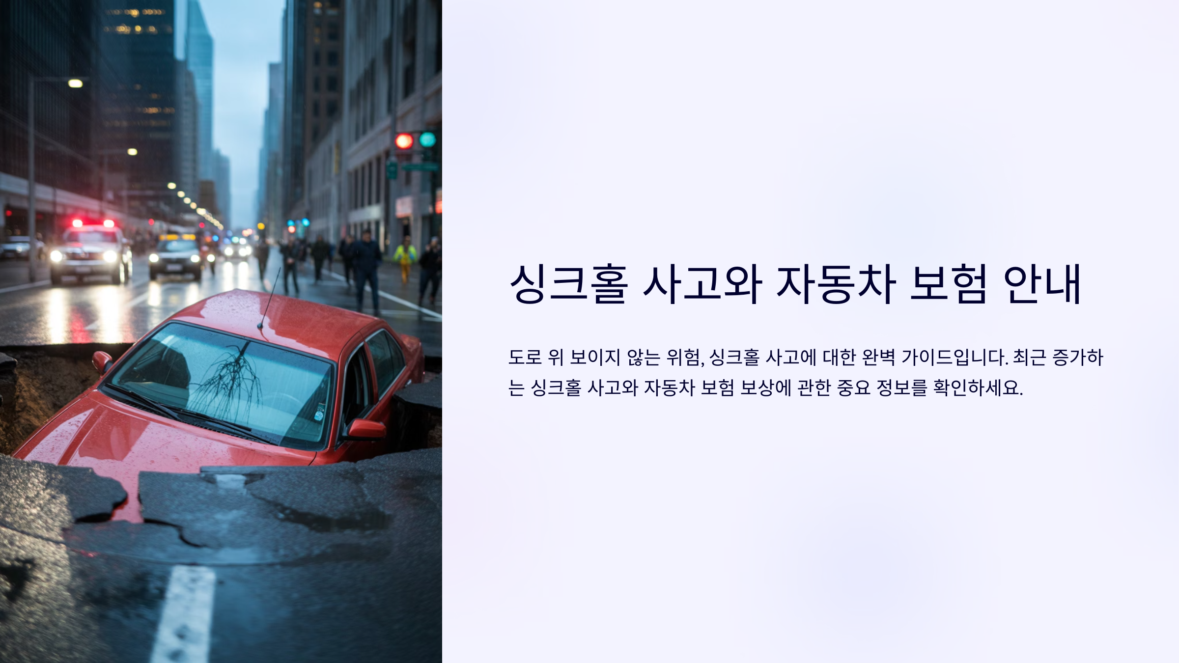싱크홀 사고는 도로 또는 지면 아래에 빈 공간이 생기면서 표면이 갑자기 붕괴되어 차량이 빠지거나 손상되는 상황을 말해요. 이처럼 갑작스럽고 예측하기 어려운 재난은 도심에서도 종종 발생하고 있어요.