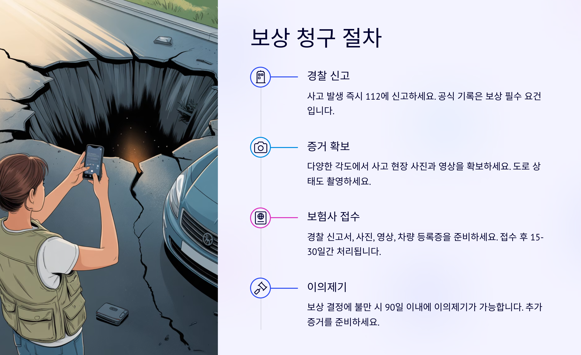 싱크홀 사고로 차량이 손상되었다면, 당황하지 말고 차근차근 절차에 따라 보상을 청구하면 돼요. 대부분의 보험사는 사고 발생 직후 신고부터 수리비 청구까지 전 과정을 안내해주기 때문에 걱정할 필요 없어요.
