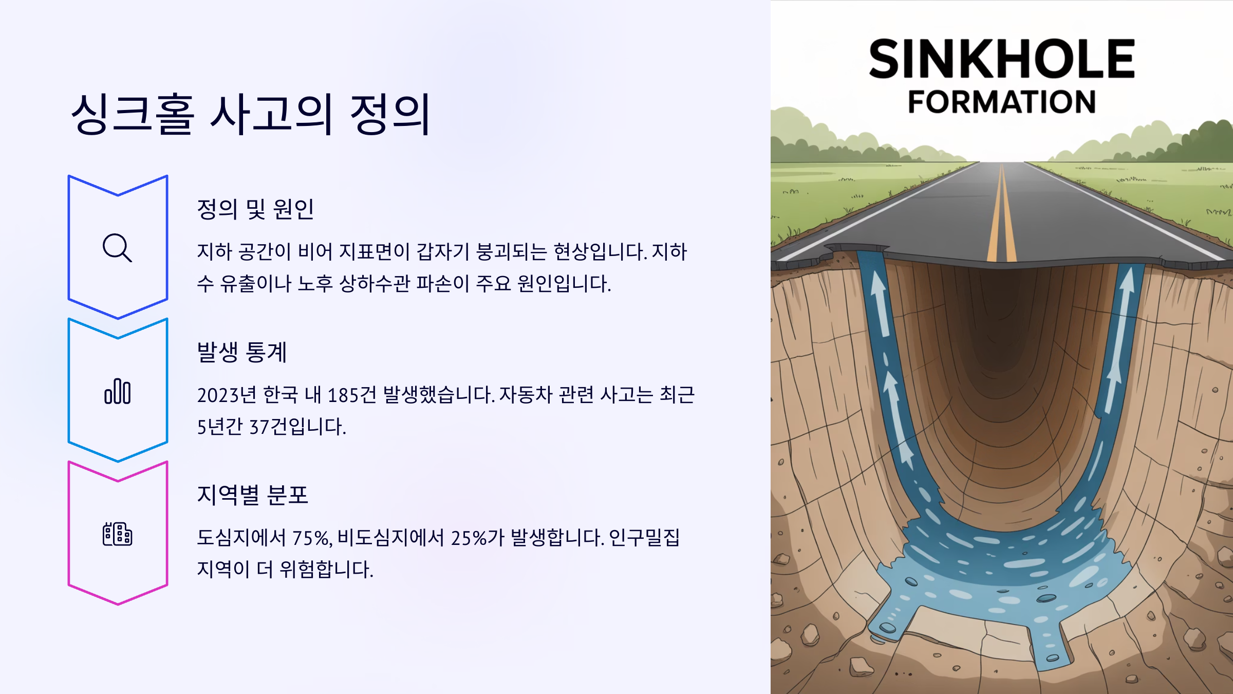 | 주 원인 | 지하 누수, 노후관, 지반침하 등 |