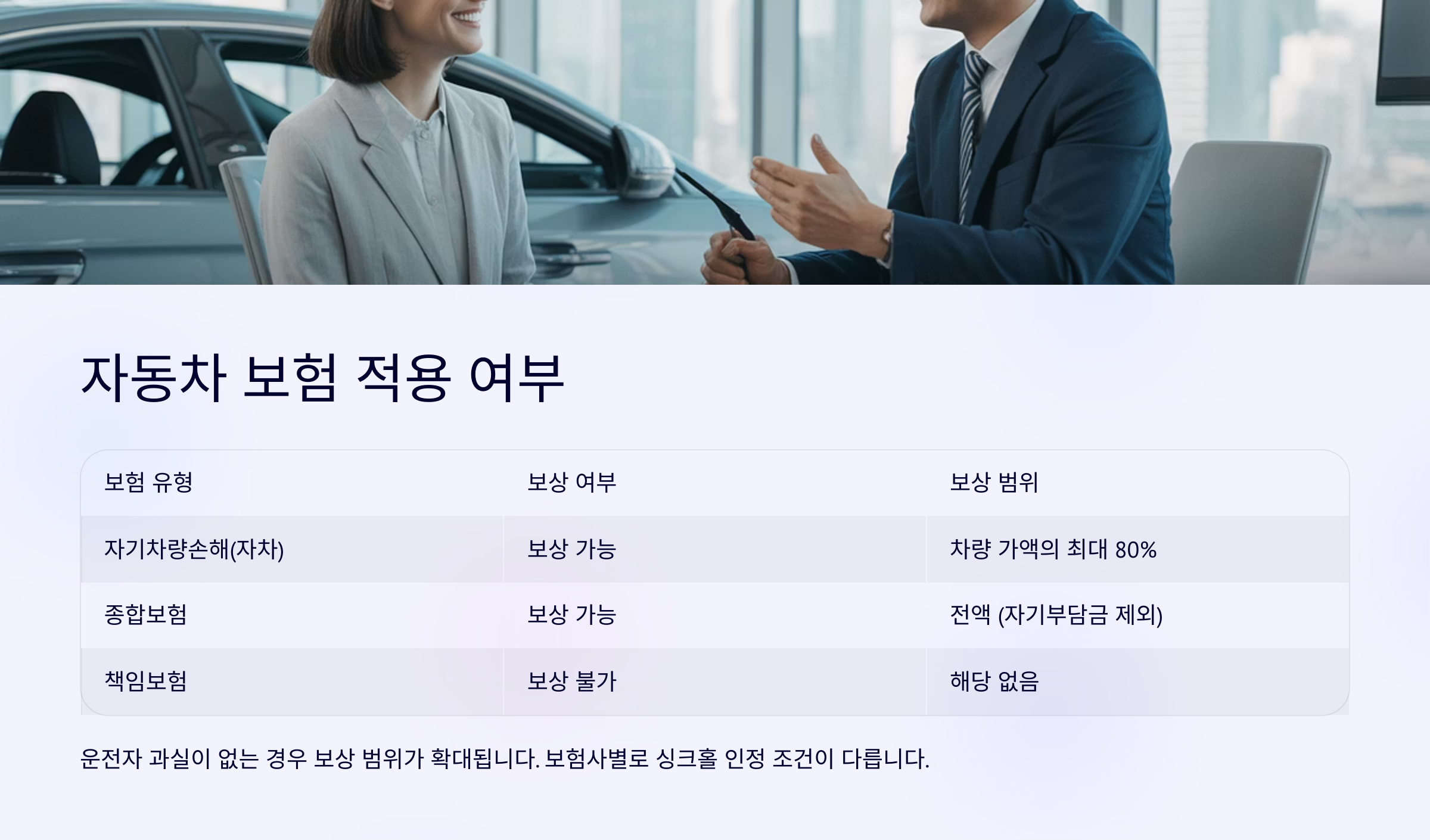 | 자기차량손해담보 | 보상 가능 | 단독 사고, 싱크홀 포함 |