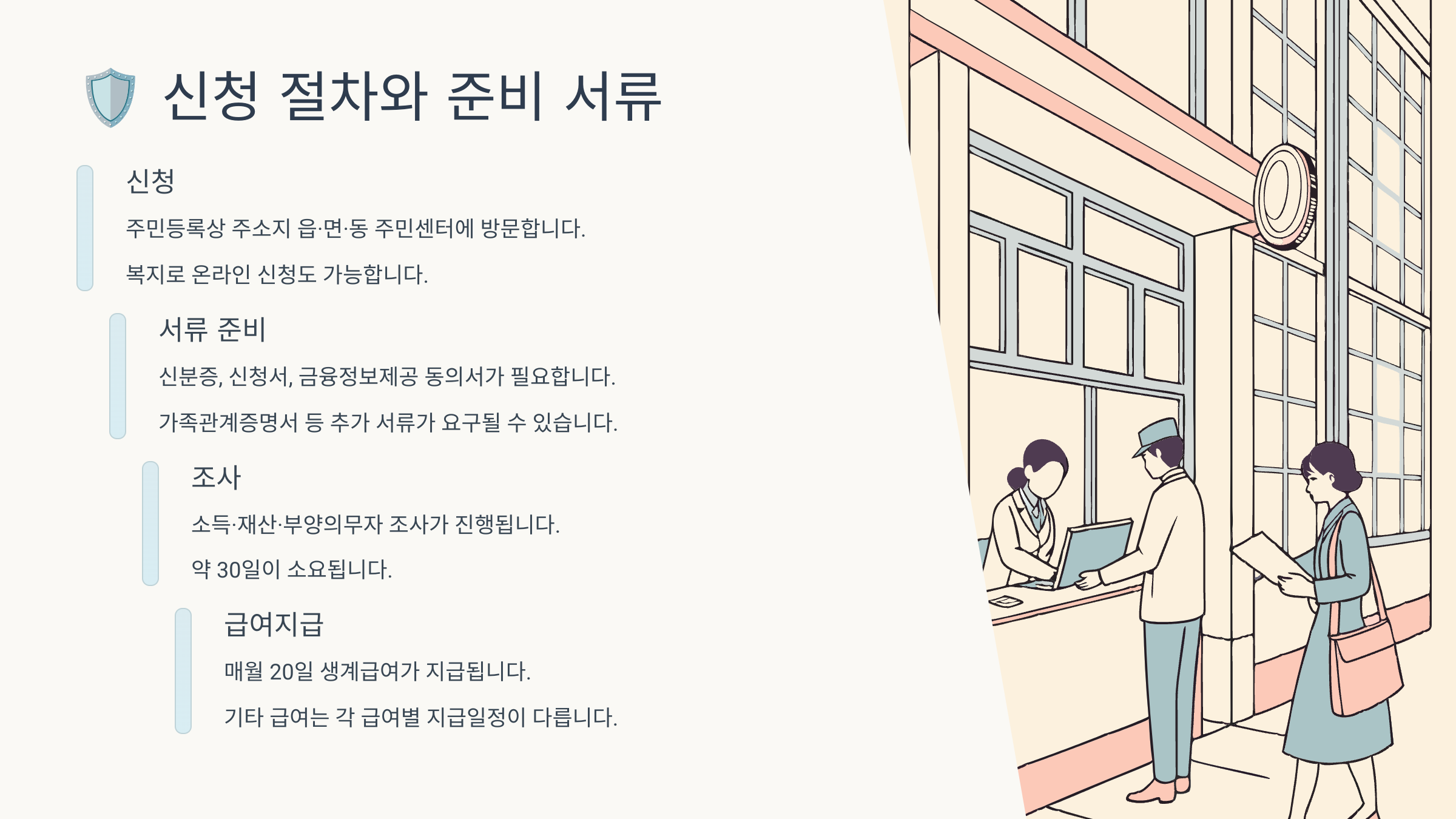 다음은 국민기초생활보장 신청을 위한 실제 절차와 필요한 서류들을 정리해드릴게요! 📄
