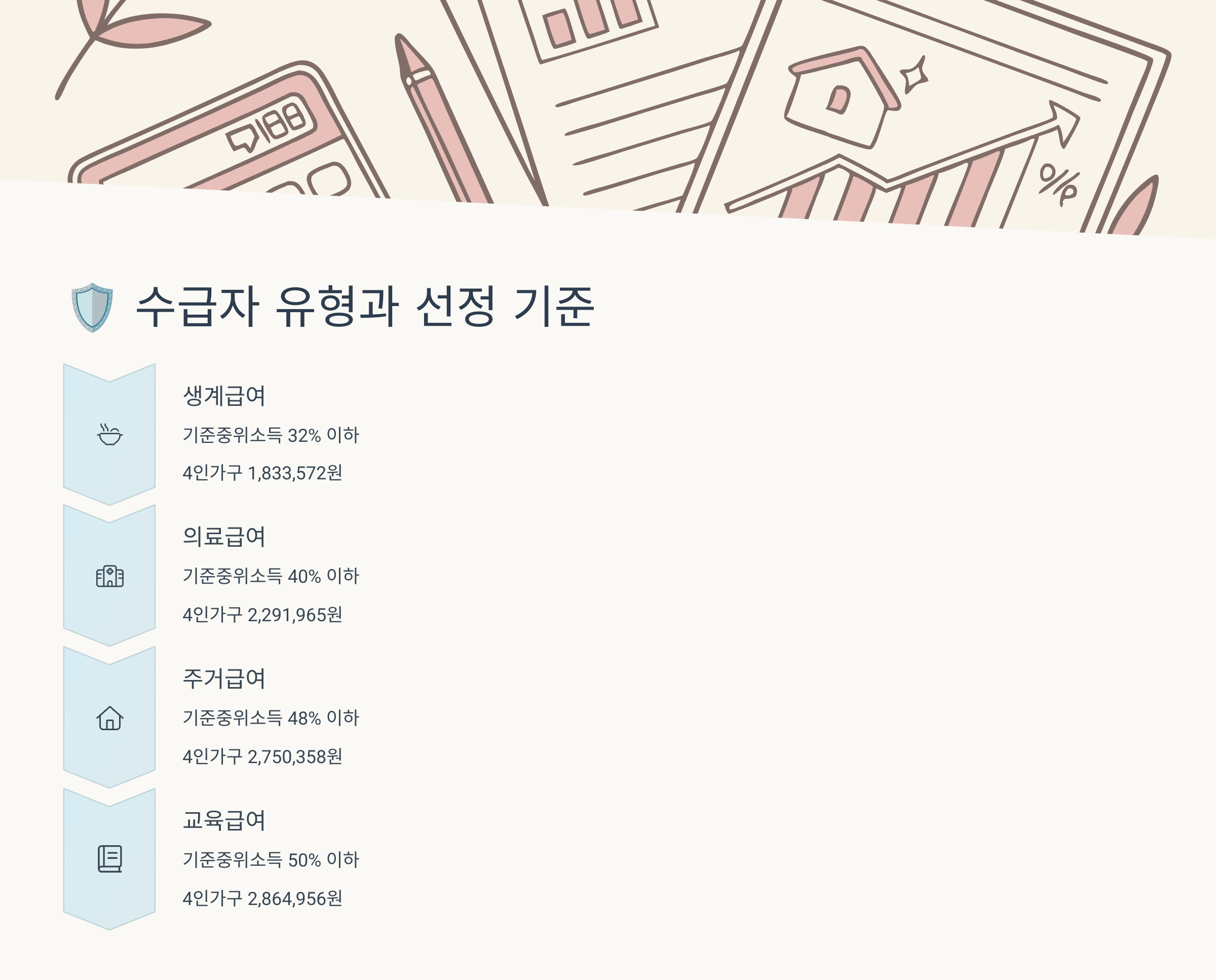 2025년 기준 중위소득을 기준으로 수급자 자격이 평가되며, 소득과 재산을 종합해 계산된 ‘소득인정액’이 중요해요. 생계급여는 중위소득 30% 이하, 의료급여는 40%, 주거급여는 50%, 교육급여는 50% 이하일 경우 지원받을 수 있어요.