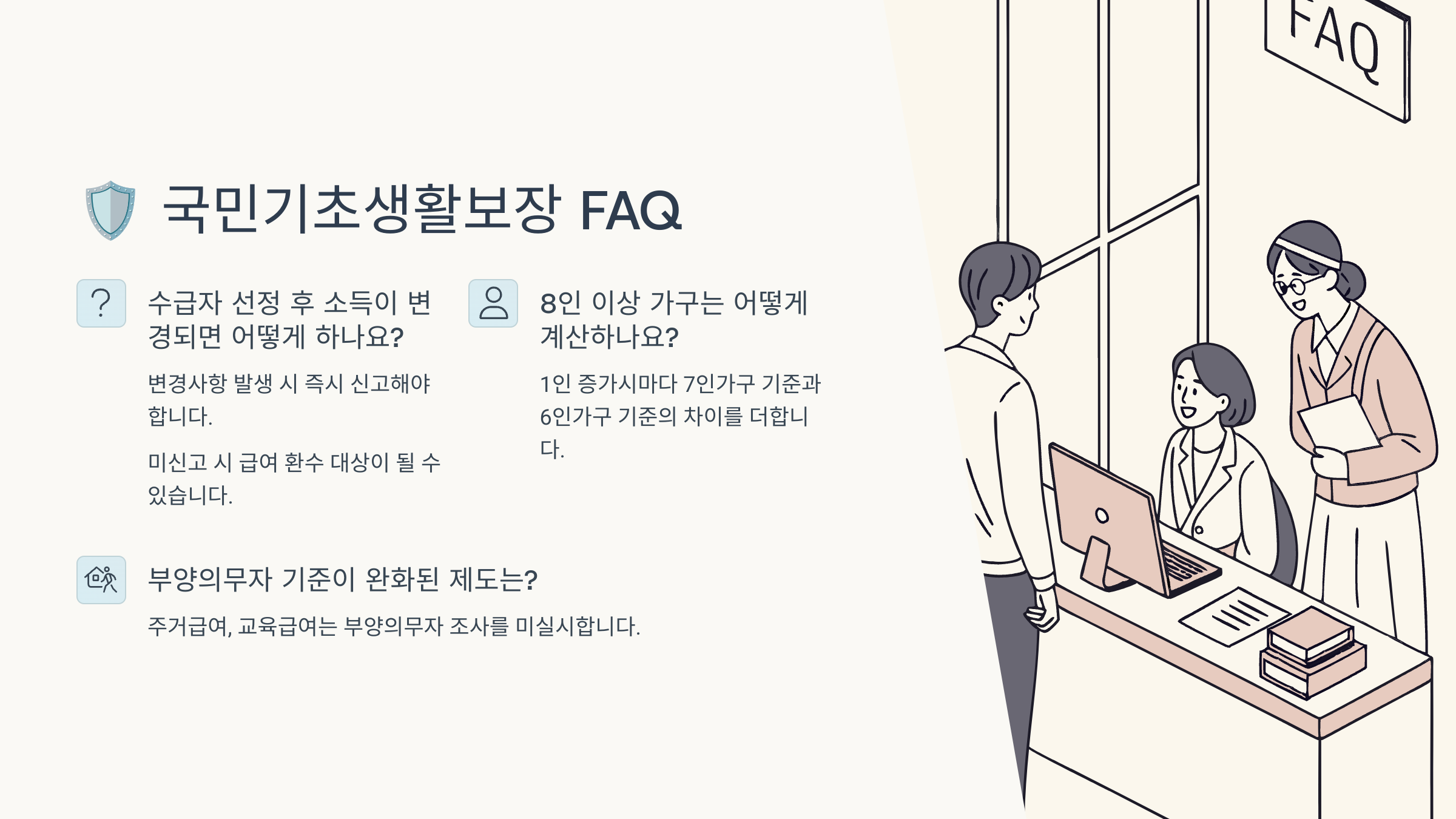 특히, 실직, 질병, 이혼, 사고, 가족 구성 변경 등은 급여 요건의 변화를 가져올 수 있는 중요한 사유예요. 이런 경우에는 꼭 주민센터 담당자와 상담을 받아보세요.
