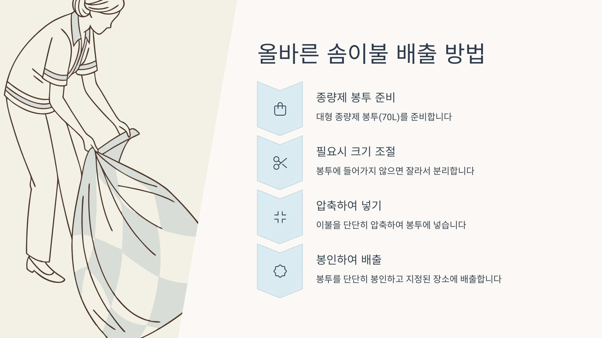 결론적으로 대부분의 솜이불은 재활용보다는 일반 폐기물로 분류돼요. 그래서 부피 줄이기, 분리 포장 등 일정한 절차를 지켜야 해요. 잘못 버리면 과태료도 나오니까 꼭 올바른 방법으로 버려야 해요!