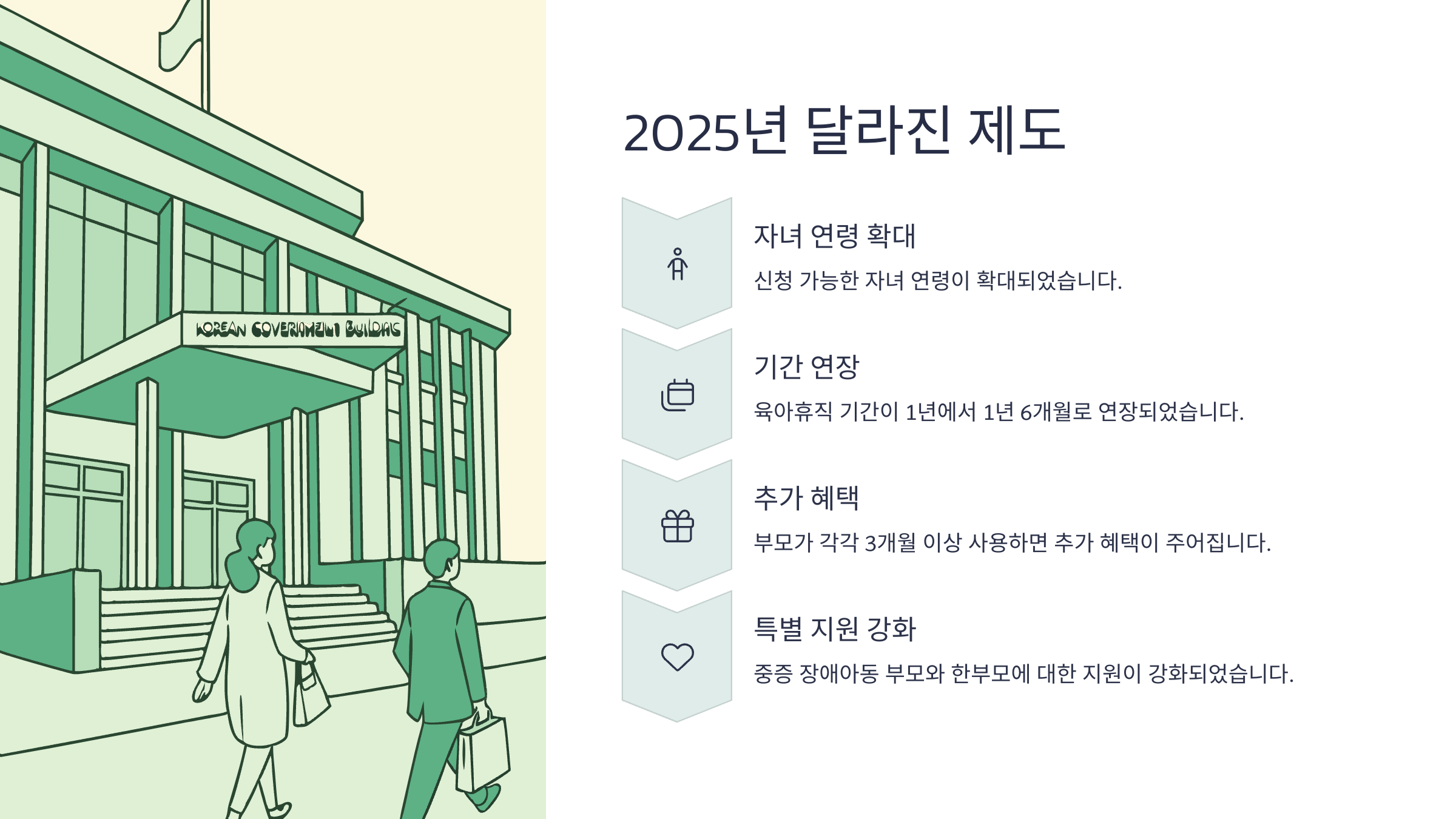 2025년의 변화된 육아휴직 제도는 단순히 '사용 가능'에서 '실제 사용에 용이함'으로 진화하고 있어요. 한 번뿐인 아이 성장기, 똑똑하게 혜택 챙겨보세요 👶✨