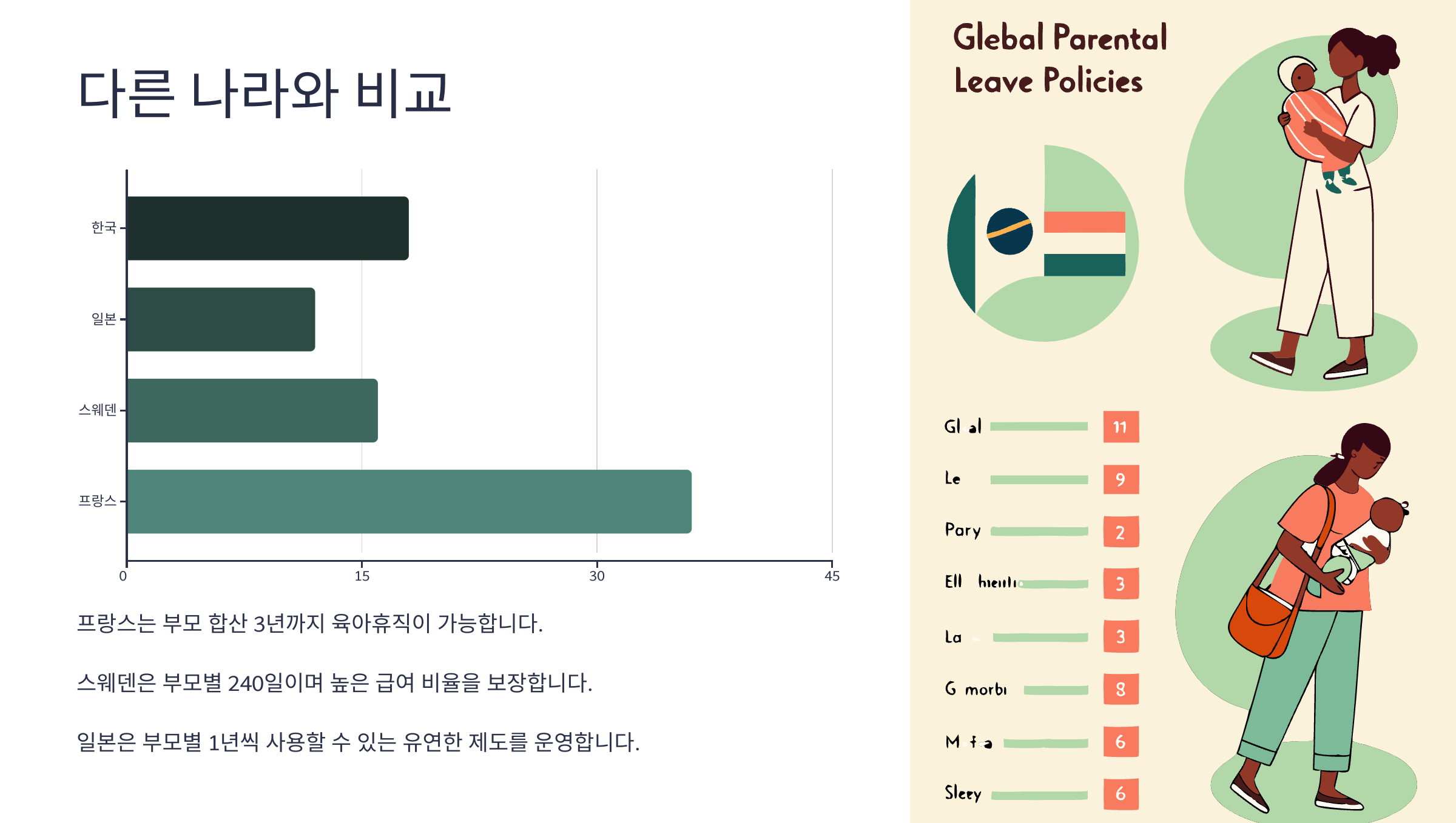 대한민국의 육아휴직 제도는 최근 몇 년 사이에 확실히 발전하고 있어요. 하지만 다른 나라들과 비교하면 어떤 모습일까요? 육아휴직이 잘 되어 있다는 국가들과 비교해보면 우리가 나아갈 방향도 좀 더 뚜렷하게 보인답니다.
