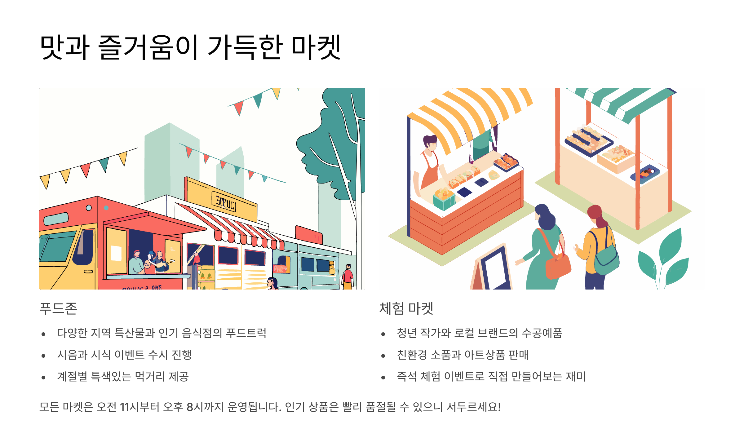 마켓과 푸드존은 보통 오후 1시부터 저녁 8시까지 운영돼요. 인기 부스는 재료 소진이 빨라서 너무 늦게 가면 닫혀 있을 수 있으니 참고하세요! 🕖