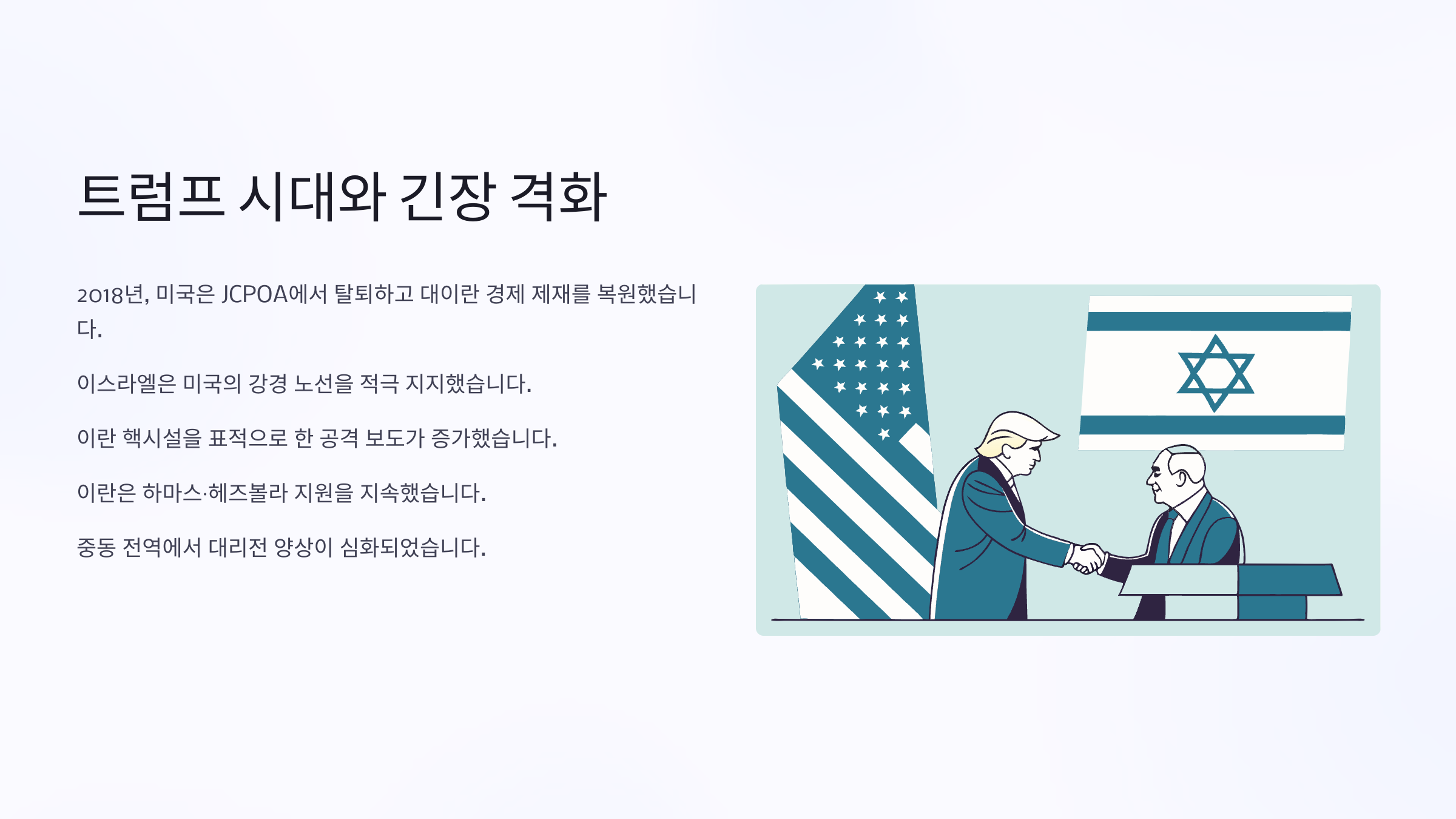 이 시기부터 이란은 핵활동을 다시 가속화하고, 서방의 사찰 제한 등 협정 이행에서 빠져나오기 시작했어요. 반면 이스라엘은 사이버 공격과 과학자 암살 등 비대칭 전략으로 대응하며 양국 간의 ‘그림자 전쟁’은 더욱 치열해졌답니다.