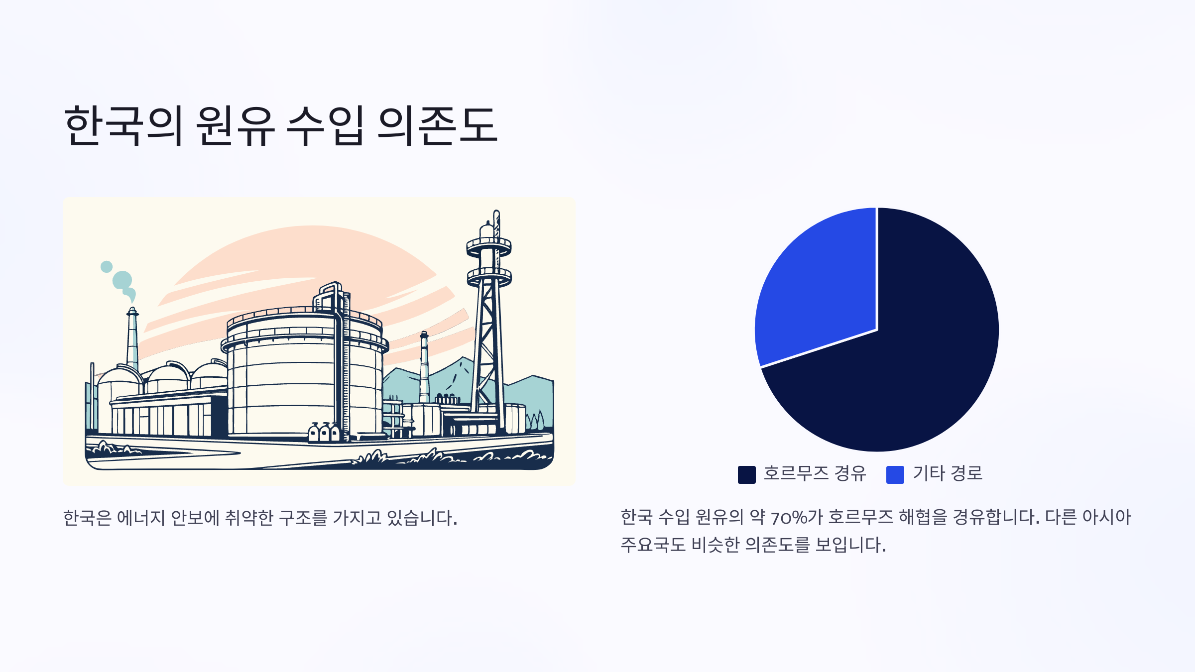 우리나라는 석유 자원이 거의 없는 나라예요. 그래서 전체 에너지 수요의 약 90% 이상을 수입에 의존하고 있는데, 특히 원유 수입의 상당 부분이 중동 지역에서 이뤄지고 있어요. 2024년 기준 한국의 원유 수입 중 약 65~70%가 호르무즈 해협을 경유해 들어온답니다.
