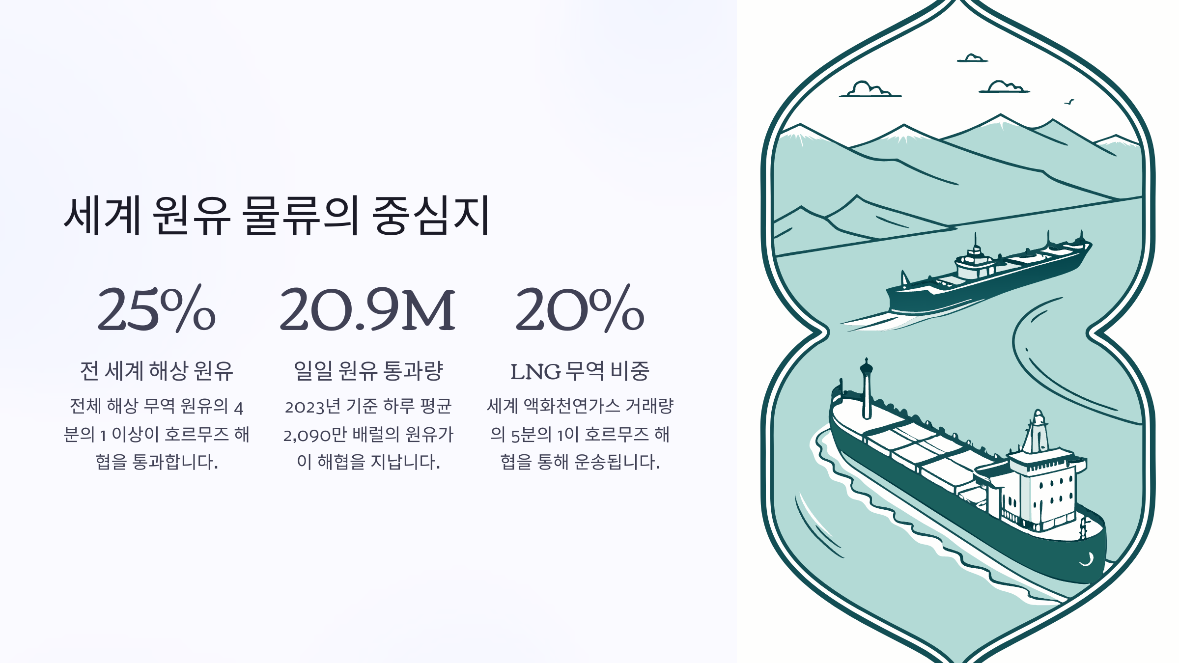 호르무즈 해협은 단순히 중동의 수로가 아니라, 글로벌 에너지 체계의 핵심 축이에요. 하루에 약 2,000만 배럴 이상의 원유가 이곳을 지나가고 있으며, 이는 세계 해상 원유 수송량의 약 30~35%에 달하는 규모예요. 전 세계의 석유 시장이 이 해협의 안정을 얼마나 의존하고 있는지 단적으로 보여주는 수치죠.