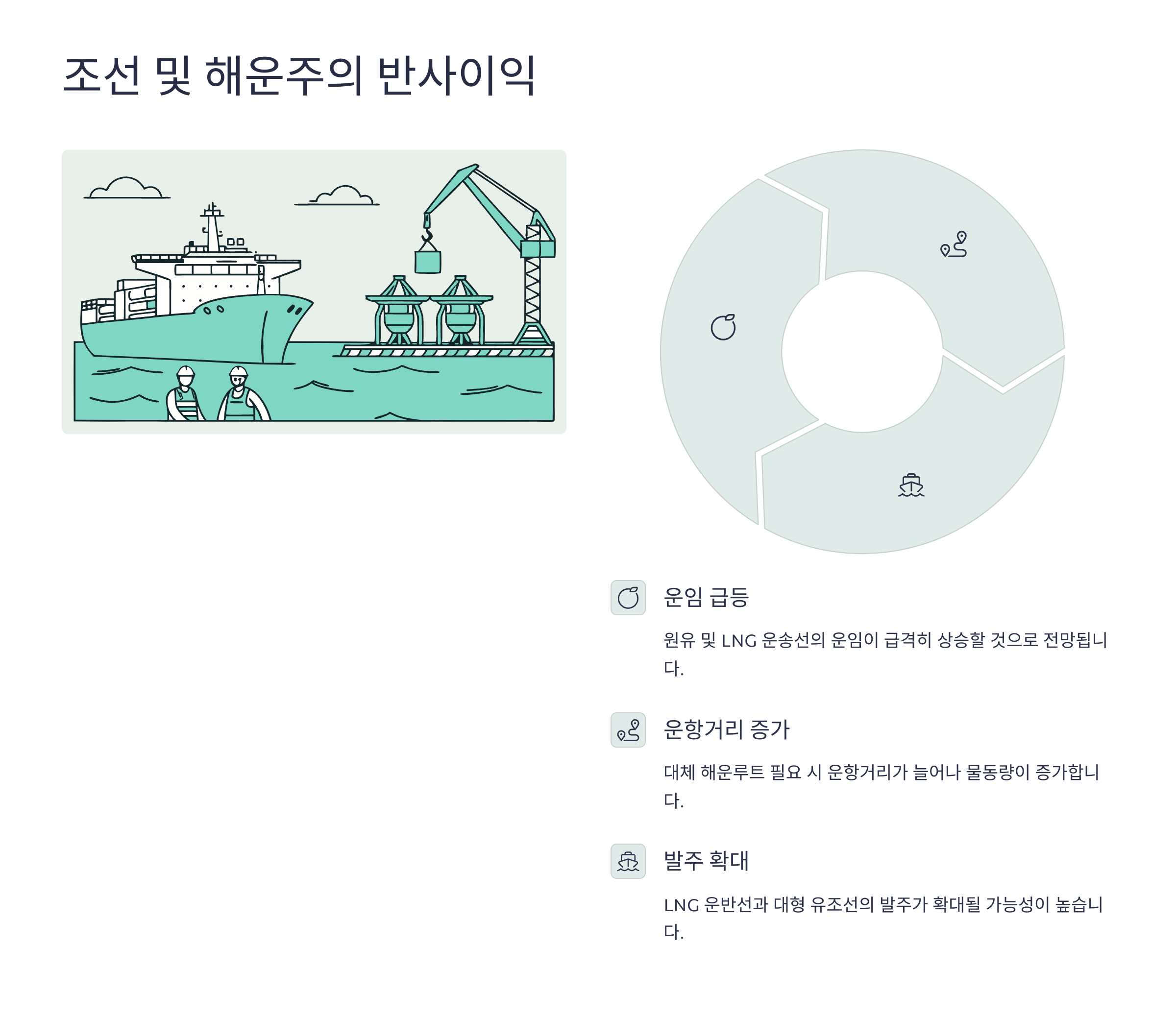 호르무즈 해협 이슈가 터지면 유조선, LNG선, 원유 운반선의 운임이 빠르게 상승하게 돼요. 이유는 간단해요. 수송 경로가 위험해질수록 더 많은 보험과 보안, 시간 비용이 들기 때문에, 선박 한 척당 운임이 높아지게 되는 거죠. 이런 상황에서 해운사와 조선주는 실질적인 수혜를 입어요.