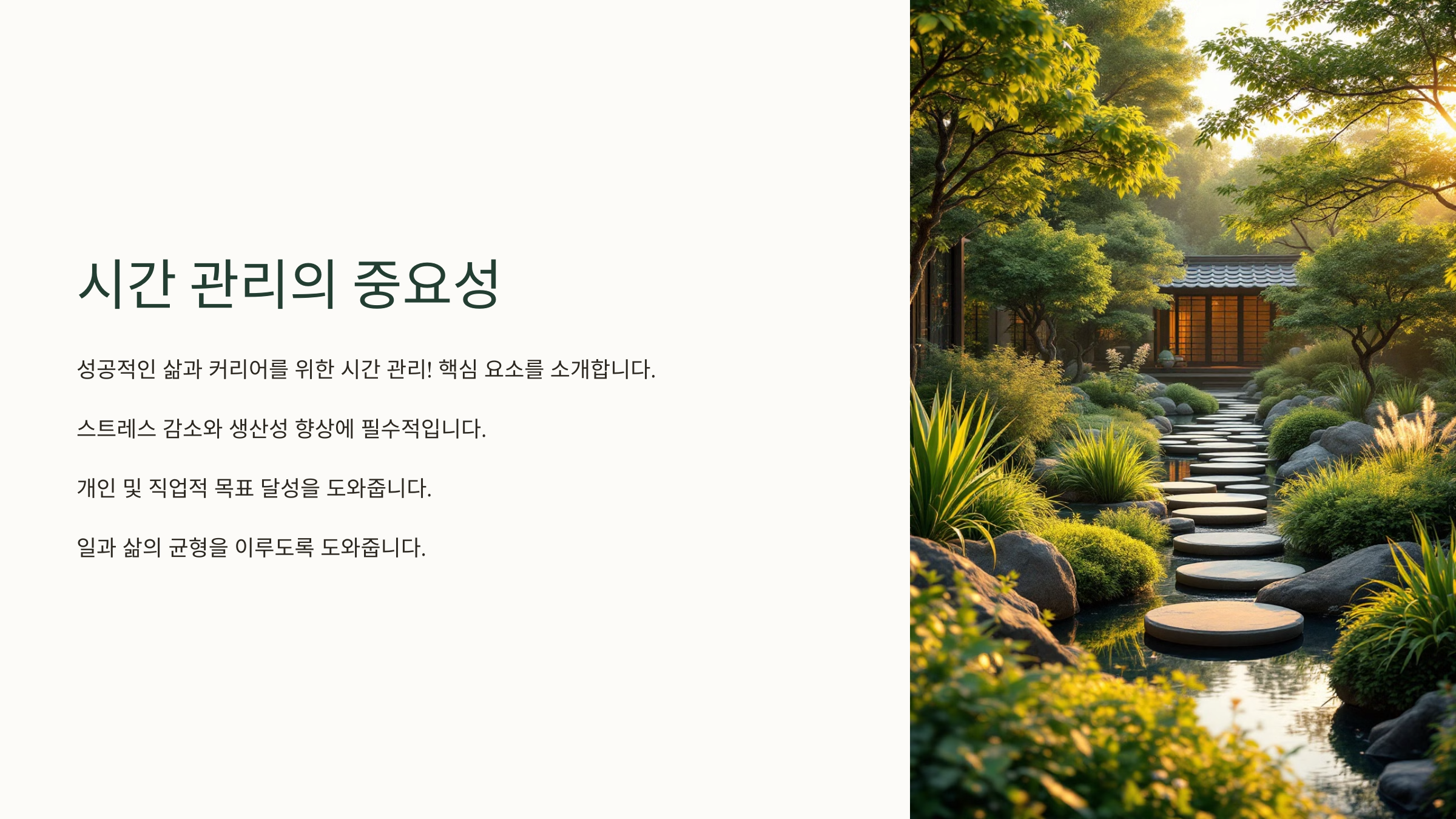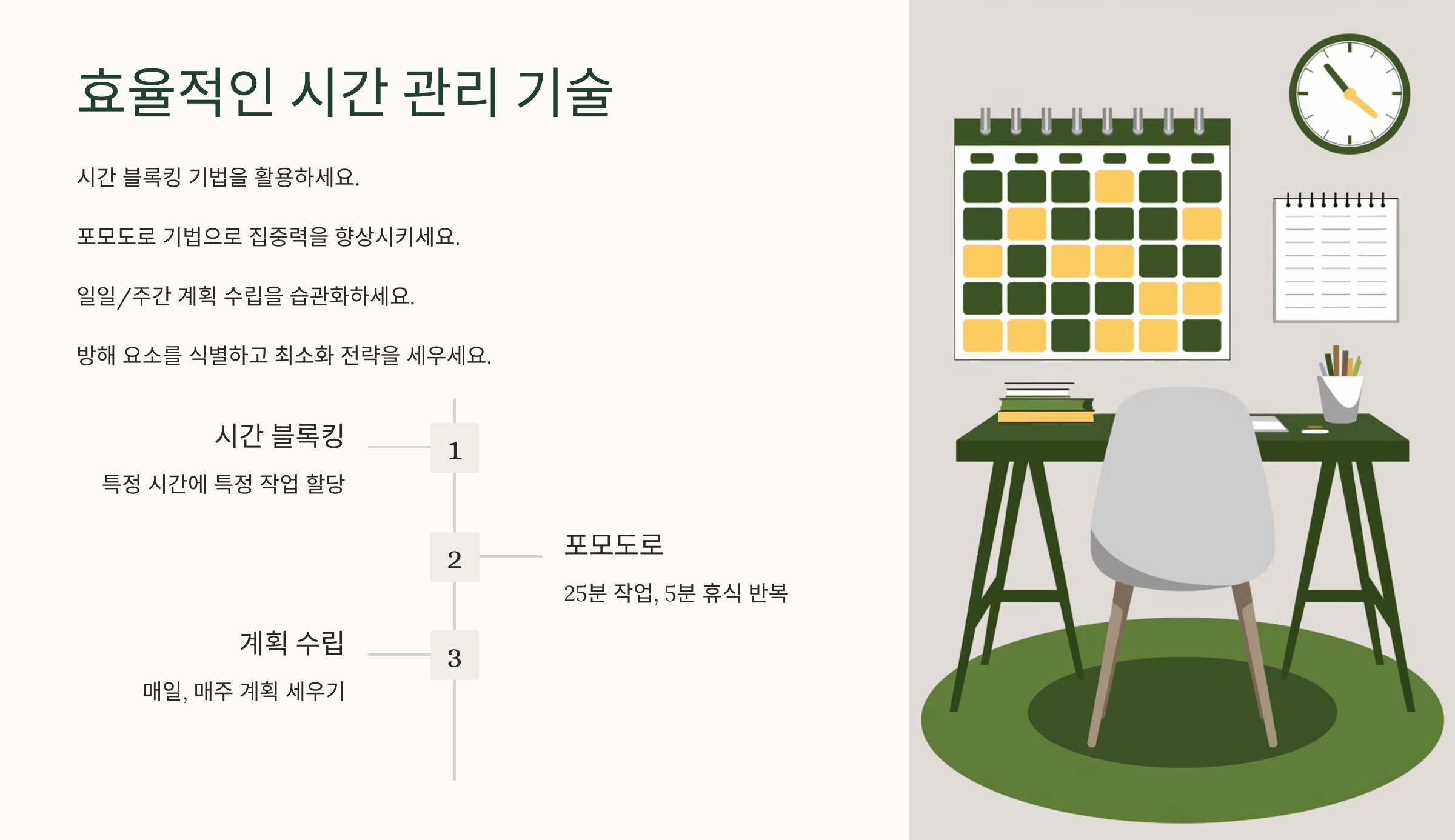 시간 관리는 단순히 하루를 계획하는 것이 아니에요. 올바르게 시간을 사용하면 **생산성이 향상**되고, 스트레스가 줄어들며, 목표를 더 빠르게 달성할 수 있어요.