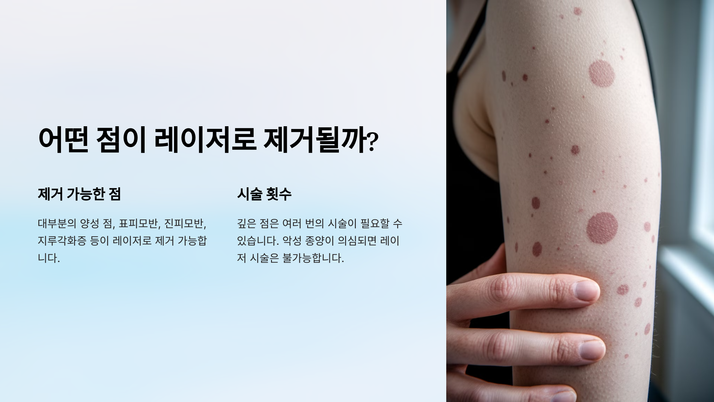 모든 점이 레이저로 제거되는 것은 아니에요! 점의 종류, 크기, 깊이에 따라 제거 방법이 달라질 수 있어요. 😊