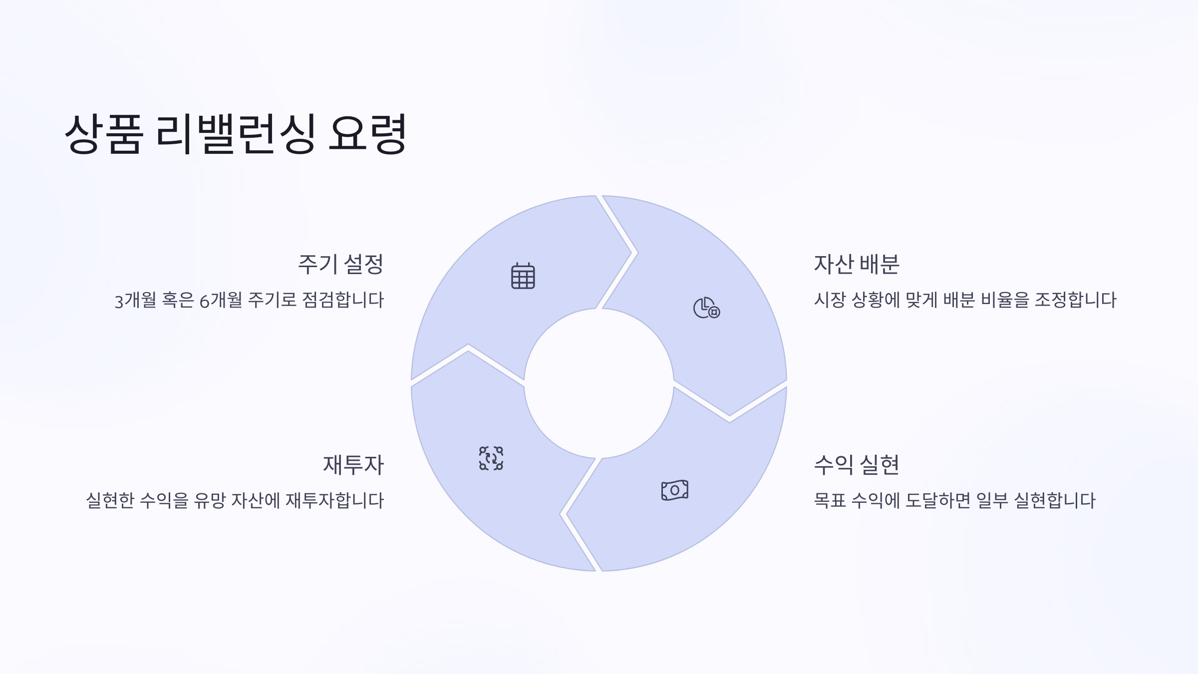 리밸런싱은 단순히 비중만 맞추는 게 아니라, 내 자산을 살아 있는 투자로 만드는 작업이에요. 주기적인 점검과 적절한 조정으로 수익률을 한층 더 끌어올려 보세요! 🔧
