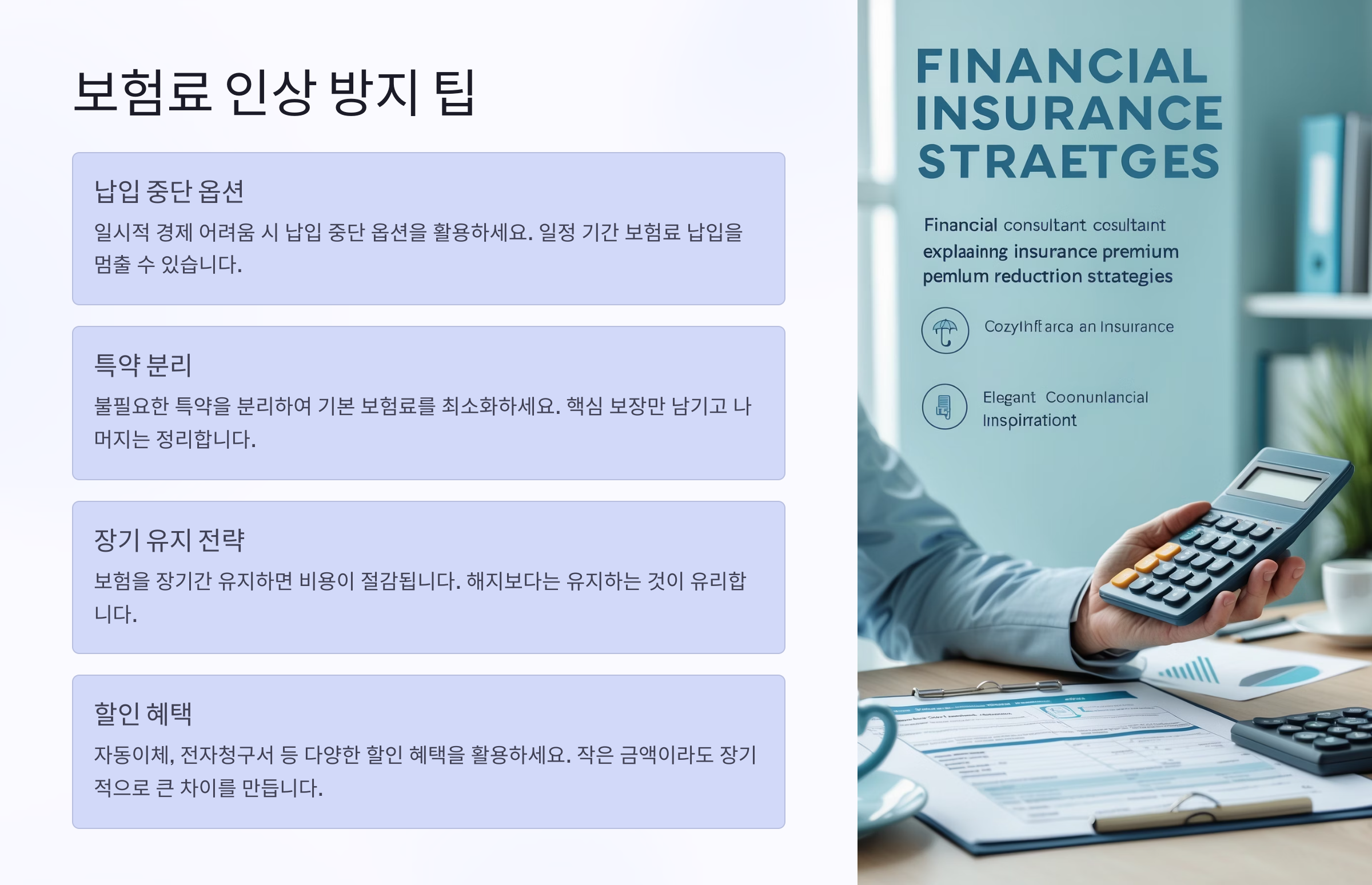 보험료는 한 번 정해지면 오랜 시간 납입해야 하니, 처음부터 잘 설계하는 게 정말 중요해요. 보험료가 오르면 투자 수익도 무의미해질 수 있으니, 위 전략을 꼭 기억해서 불필요한 인상을 막아보세요! 🧾