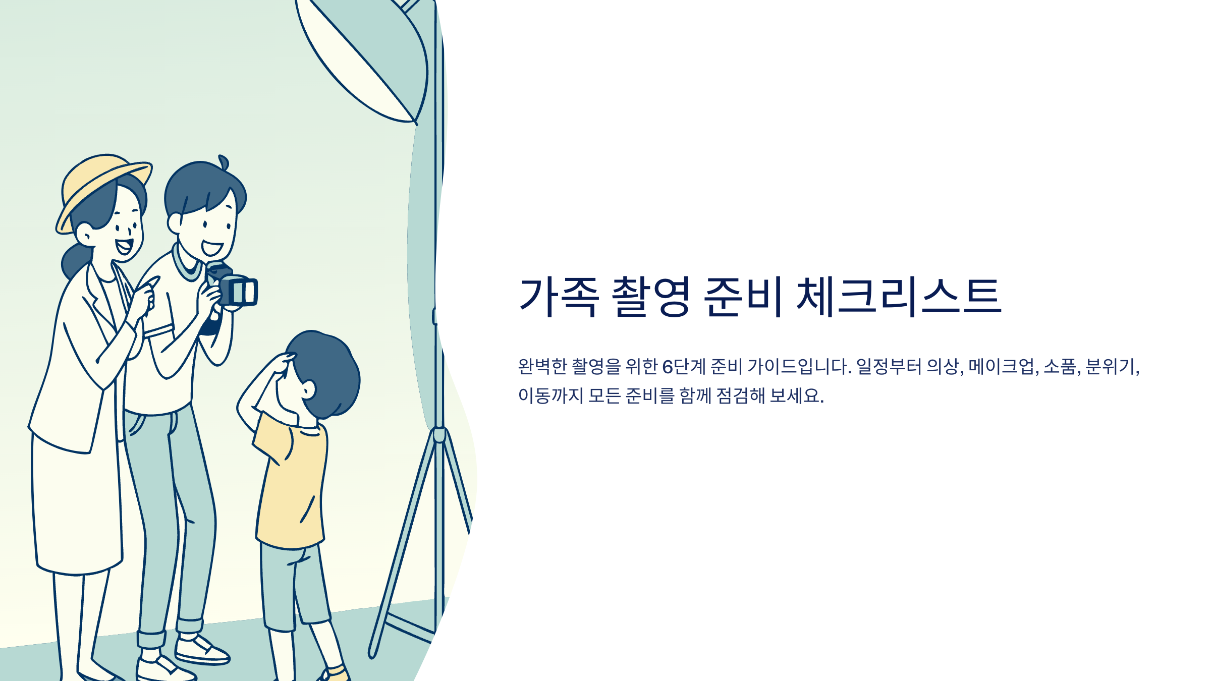 가족사진 촬영 전 1시간, 이 준비 루틴만 따르면 누구나 여유롭게 감동적인 촬영을 할 수 있어요. 마음도, 몸도 천천히 풀면서 즐기는 시간이 되길 바랄게요 😊📷