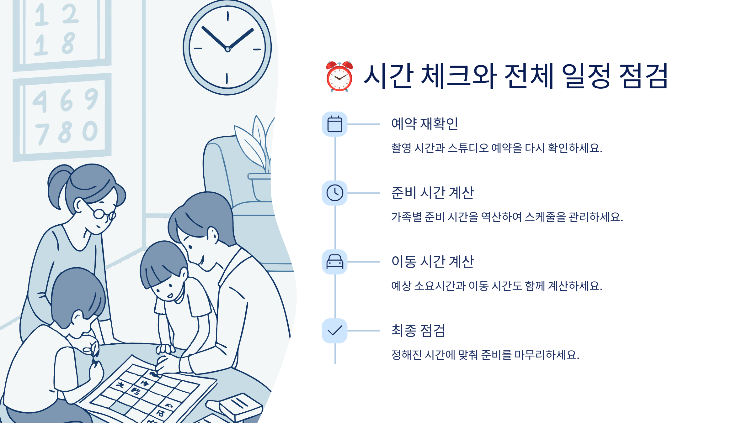 이때는 단순히 시계만 보는 게 아니라, 촬영 스케줄 전체를 다시 한 번 훑어보는 시간이기도 해요. 스튜디오 예약 시간, 야외 촬영일 경우 날씨나 해 지는 시간, 포토그래퍼 도착 시간까지 모두 점검해요. 아이가 있는 가족이라면, 아이의 낮잠이나 간식 시간도 미리 고려해두는 게 좋아요.