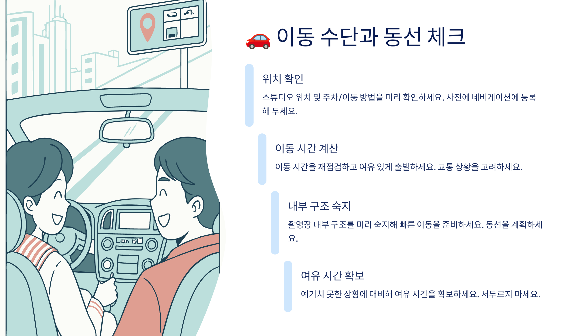 준비를 마쳤다면, 마지막으로 체크할 건 이동 계획이에요. 촬영장까지 얼마나 걸리는지 실시간 교통 상황을 보고, 이동 수단이 문제없는지 확인해요. 차량을 이용한다면 주차 공간까지 미리 확인해두는 게 좋고, 대중교통이면 환승 시간까지 체크해야 해요.