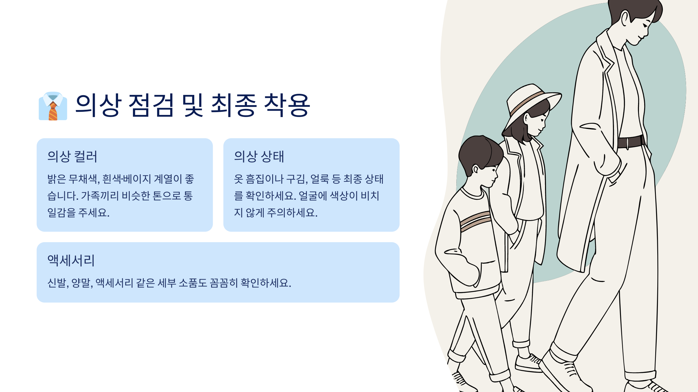 가족 간 의상 톤이나 콘셉트가 잘 맞는지도 거울 앞에서 확인하면 좋아요. 흰 셔츠는 살짝 비칠 수 있으니 이너웨어가 보이지 않도록 체크하고, 구두나 운동화까지 전체적인 톤을 맞춰주는 센스가 필요해요.