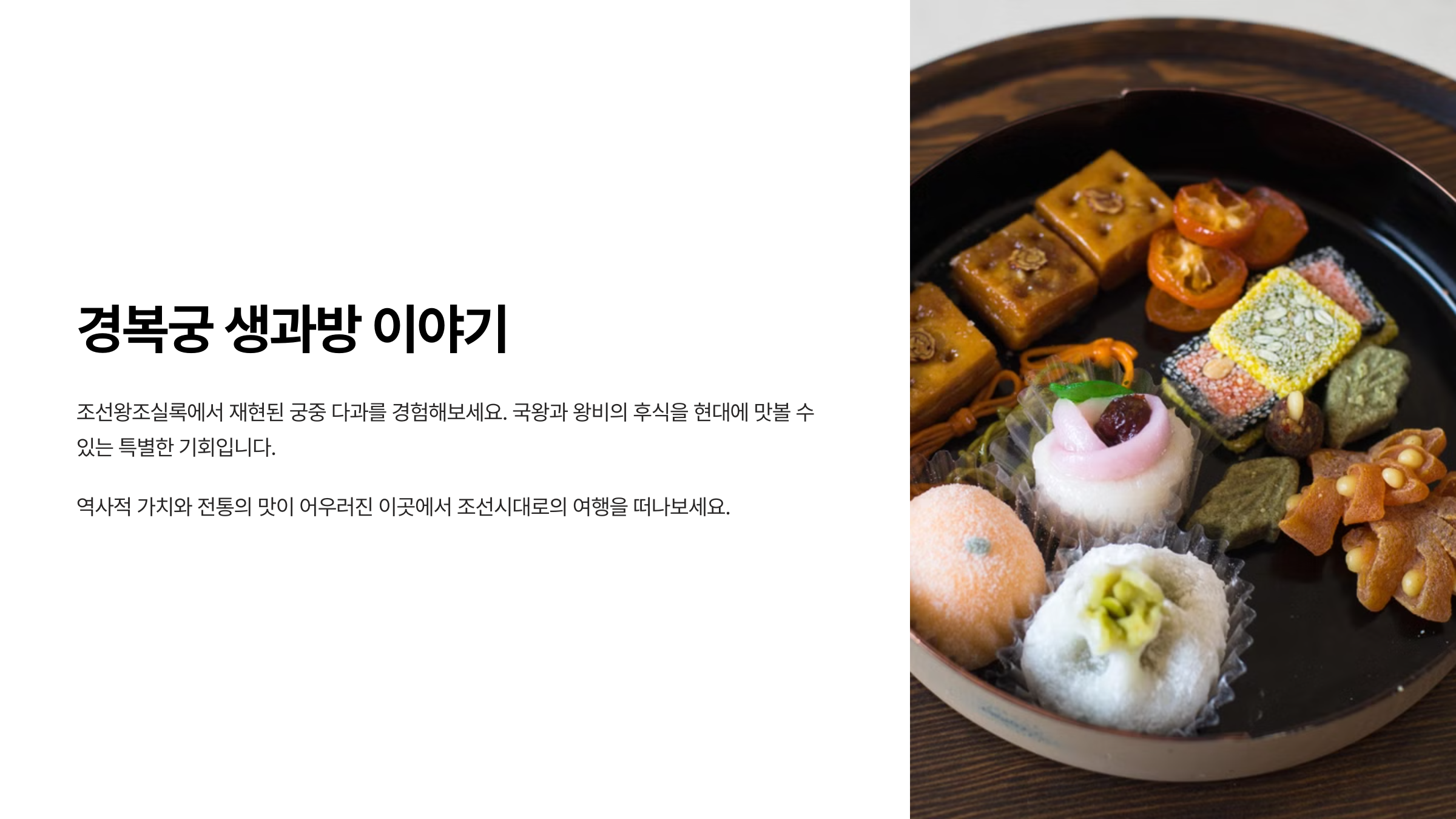 생과방에서는 조선시대 왕과 왕비가 즐기던 전통 다과를 현대적으로 재현한 디저트를 맛볼 수 있어요. 매년 계절에 따라 구성은 조금씩 달라지지만, 기본적으로 3~4종의 다과와 1종의 전통차가 세트로 나오는 ‘궁중 다과상’ 형식이에요. 🥢