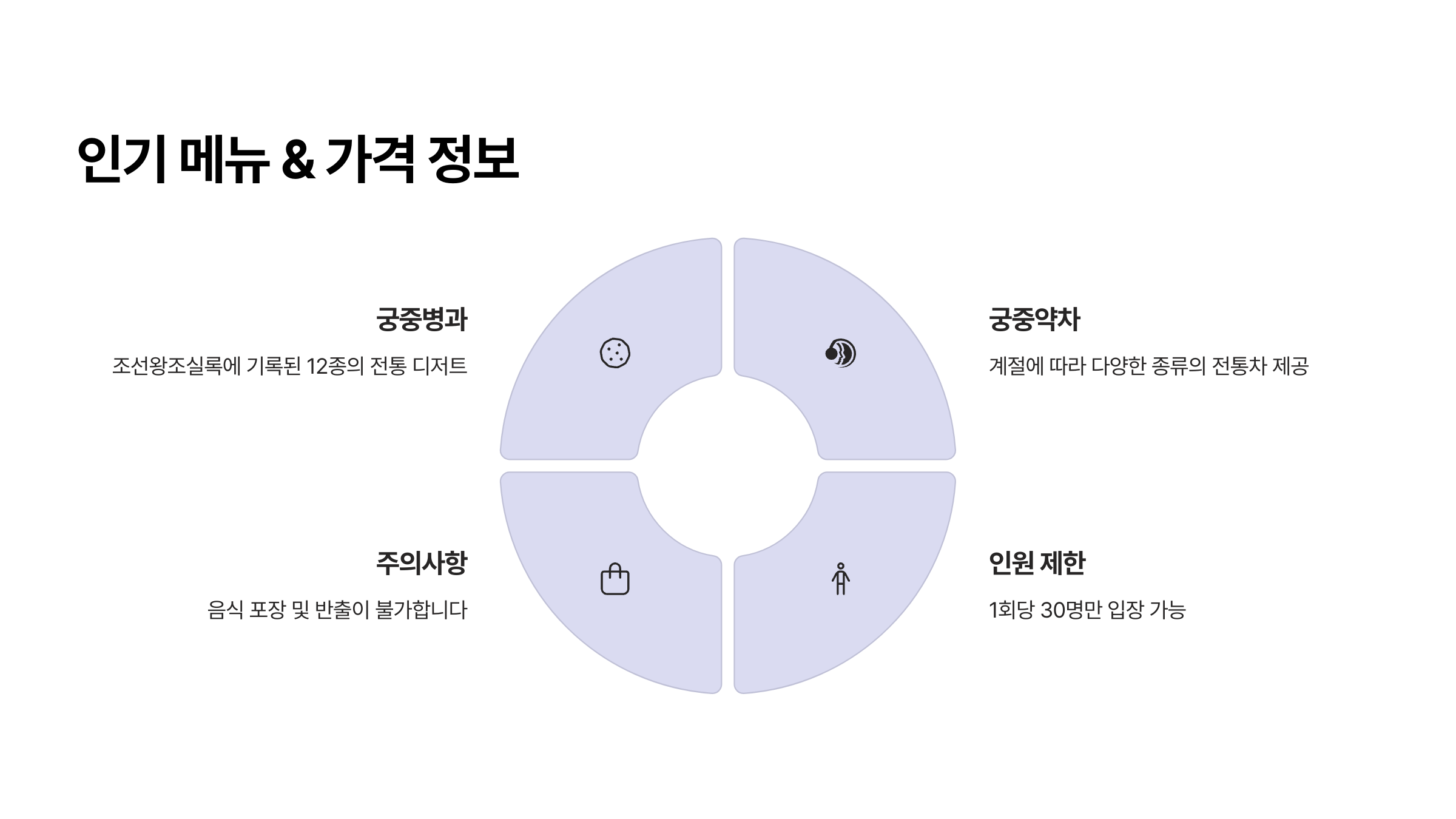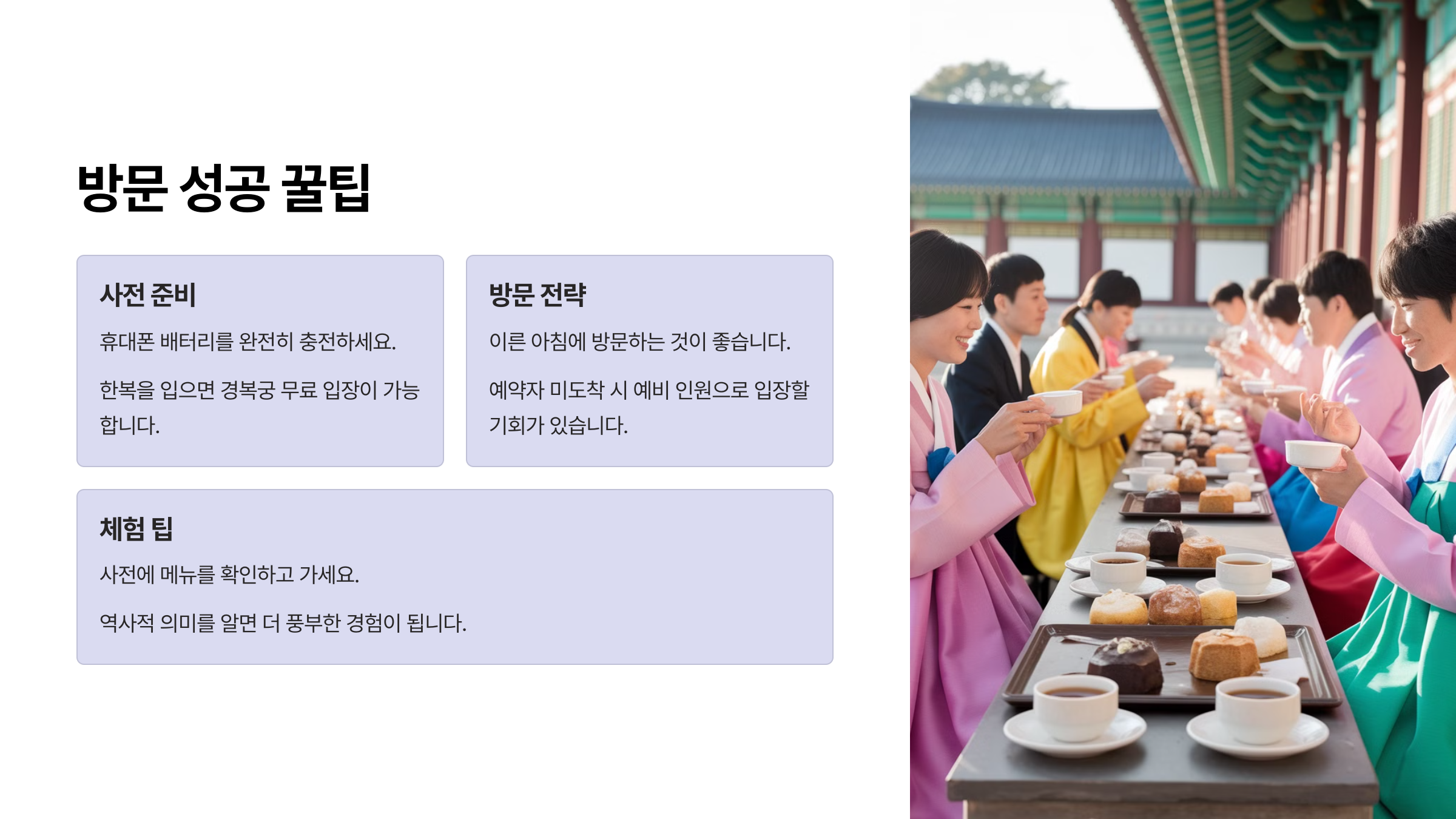 한복 입장객은 경복궁 입장이 무료이기 때문에, 한복 대여하고 입장 후 생과방을 찾는 게 요즘 인기 루트예요. 다만 생과방 앞엔 웨이팅 줄이 생기기도 하니, 회차 시작 20~30분 전에는 미리 가서 자리를 체크해두는 걸 추천해요.⏰