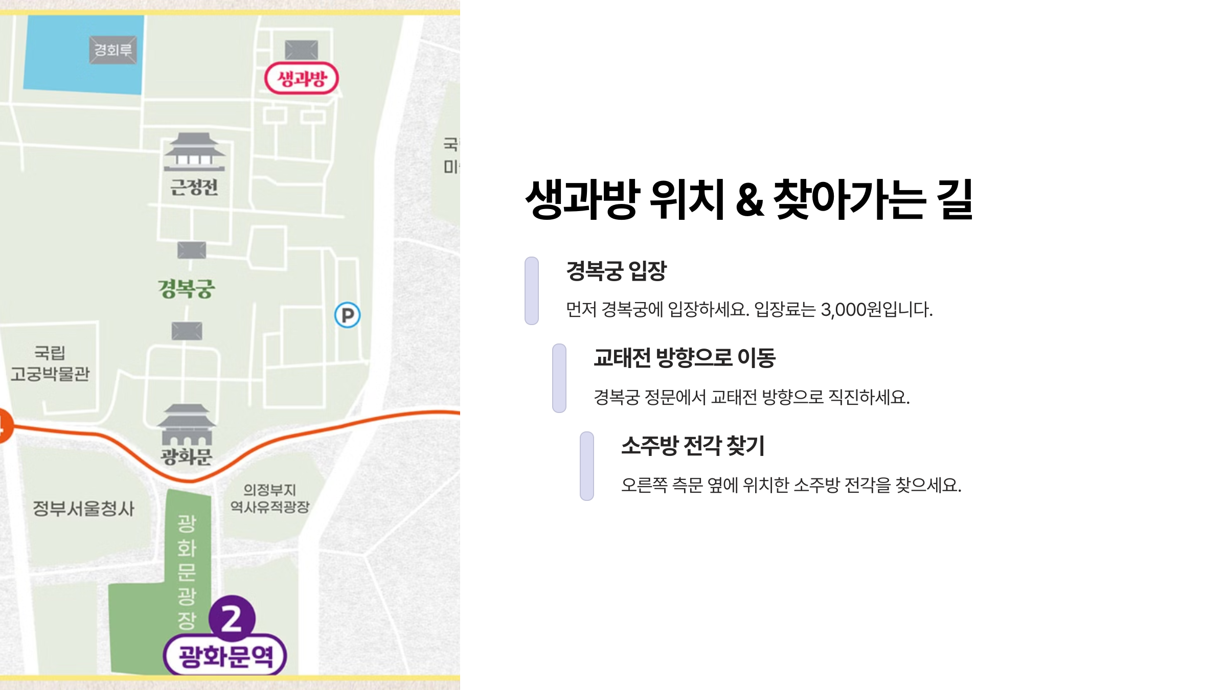 정확한 위치는 “집옥재” 동편</strong이고, GPS로는 “경복궁 생과방”을 검색하면 뜨지만, 구글맵보다는 네이버지도/카카오맵이 더 정확해요. 입장 후 ‘동궁 권역’ 방향으로 이동하면 되고, 경복궁 안내도에서도 ‘생과방’ 표시가 따로 되어 있어요.📍