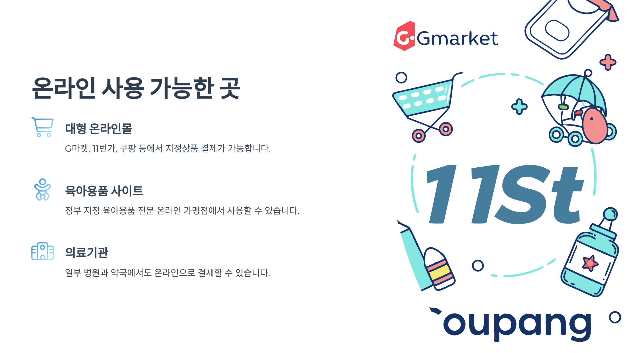 대표적인 온라인 사용처로는 쿠팡, G마켓, 11번가, 아이누리몰, 임신육아종합포털 아이사랑 같은 곳이 있어요. 특히 아이사랑몰은 국가 지정 공식 쇼핑몰로, 국민행복카드 사용이 완벽하게 지원돼요. 여긴 분유, 기저귀, 아기용품이 다양하게 준비돼 있어서 아주 실속 있죠.
