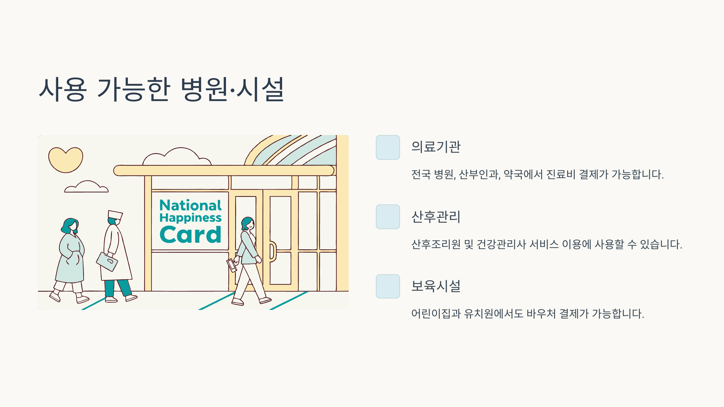 대표적으로 사용 가능한 시설은 산부인과, 내과, 소아과, 건강검진센터, 조산원, 약국 등이에요. 산모·신생아 건강관리 서비스를 운영하는 기관에서도 사용할 수 있고요. 전국 병의원 중 ‘국민행복카드 가맹점’으로 등록된 곳은 거의 대부분 해당돼요.