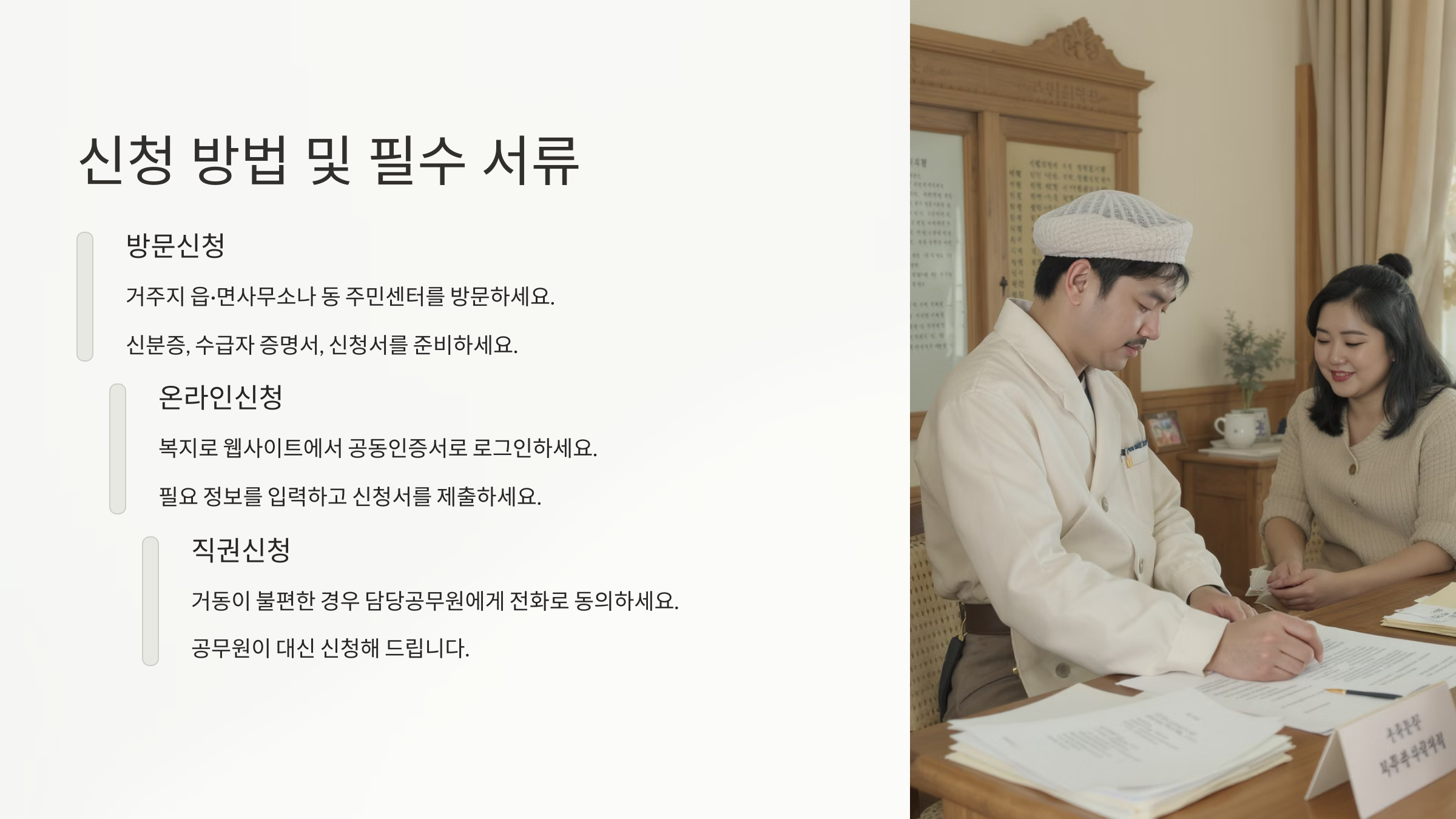 시간이 부족하거나 병원 동행이 잦은 어르신들은 복지관 방문 후 서류를 챙겨 주민센터에 제출하는 방식으로 준비하면 훨씬 수월하게 신청을 마칠 수 있어요.