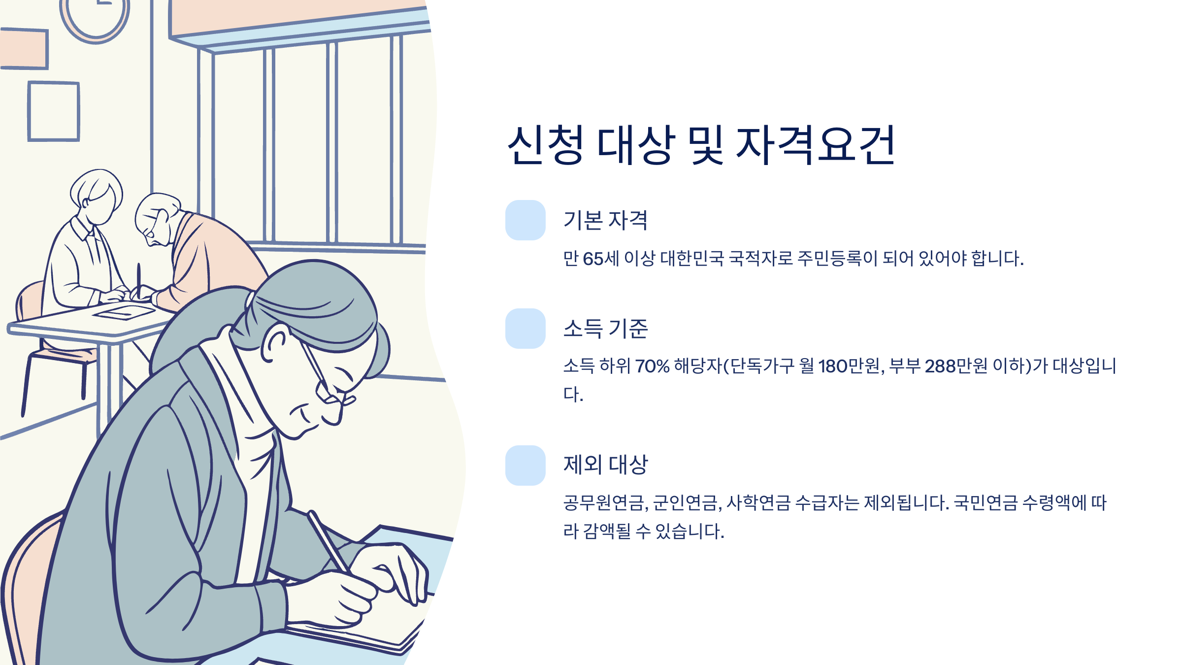 근로소득, 연금소득, 부동산 소유 여부까지 모두 포함해서 평가되므로, 신청 전에 국민연금공단이나 주민센터에 사전 상담을 받아보는 걸 추천해요. 특히 단독가구 어르신은 수급 확률이 높기 때문에 놓치면 너무 아까워요!
