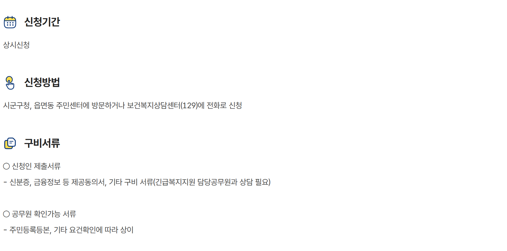 - 거주지 관할 주민센터 또는 보건복지부 콜센터(129) 문의