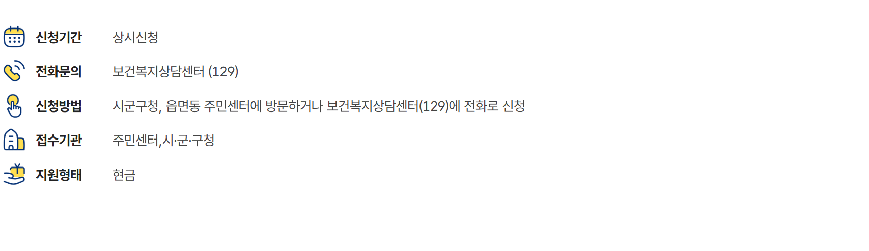 - 거주지 관할 주민센터 또는 보건복지부 콜센터(129) 문의