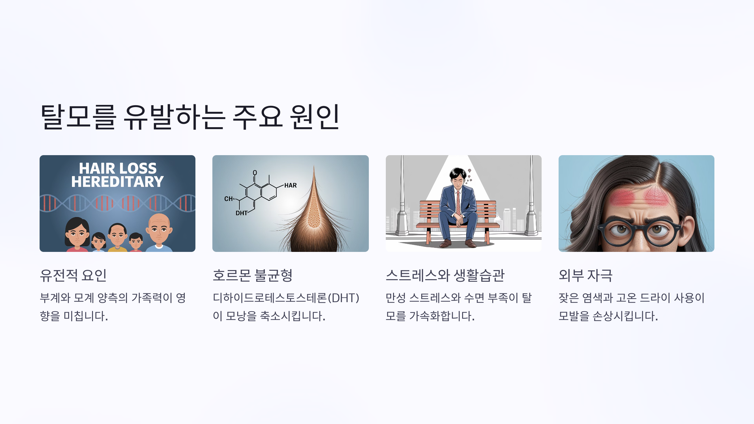 | 두피 위생 문제 | 염증, 피지 축적으로 모낭 손상 | ★★★ |