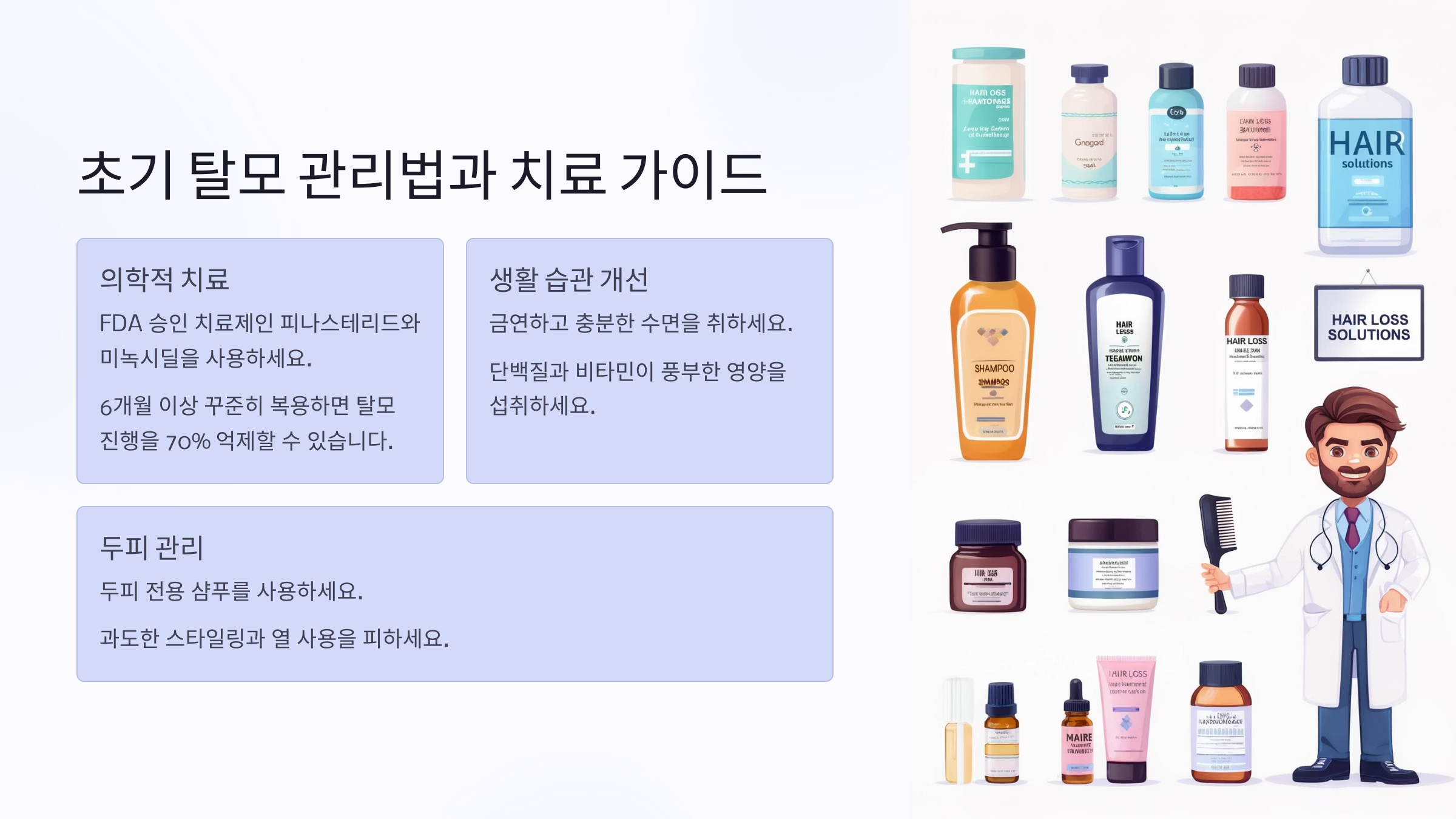 탈모는 단순히 약만 바르거나 먹는다고 해결되지 않아요. 모발은 전신 건강과 연결돼 있기 때문에, 전반적인 라이프스타일 개선이 병행되어야 해요. 특히 초기일수록 생활습관 변화만으로도 진행을 멈추는 경우가 많답니다!