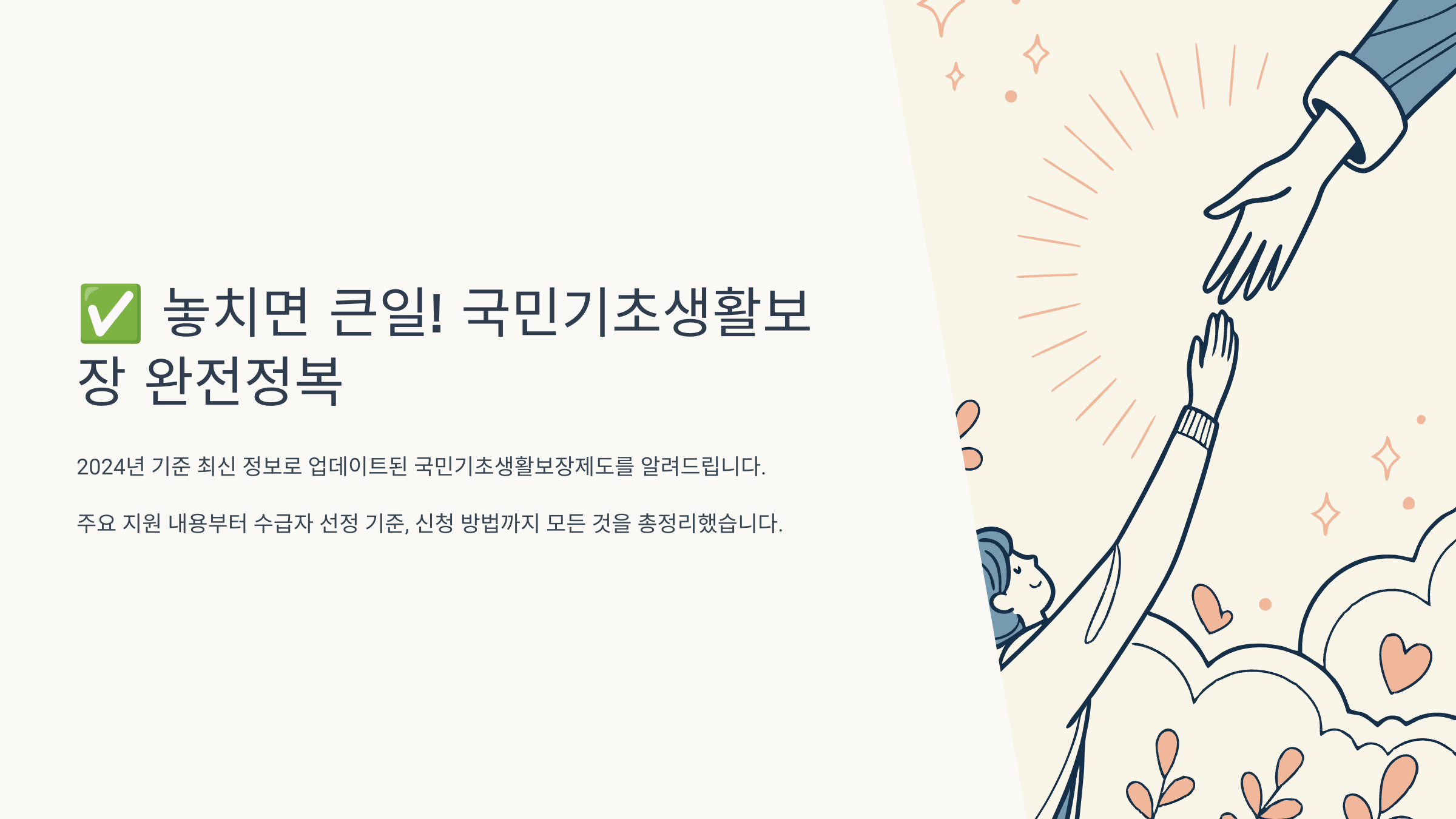 가장 안타까운 건 '내가 받을 수 있었던 혜택을 몰라서 놓치는 경우'예요. 그래서 지금부터 하나씩 차근차근, 국민기초생활보장을 완전 정복해볼게요!