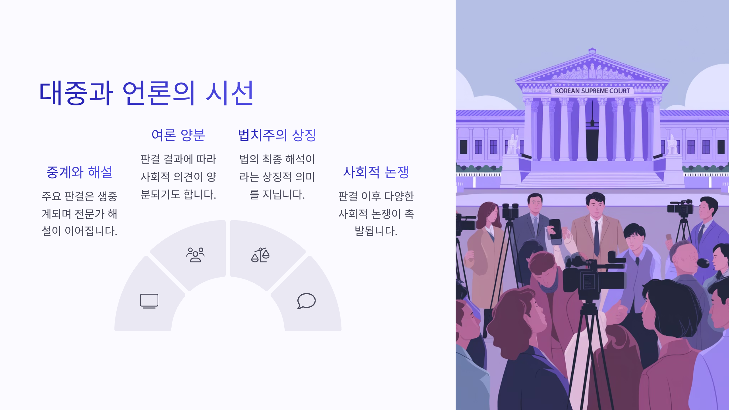 이처럼 전원합의체 판결은 언론, 시민, 전문가 모두가 함께 참여하는 하나의 거대한 ‘공론장’을 형성하게 돼요. 그래서 이 판결 하나가 단지 법정 안에서 끝나는 게 아니라, 사회 전체가 함께 읽고 해석해 나가는 문화적 이벤트가 되는 거죠. 😊