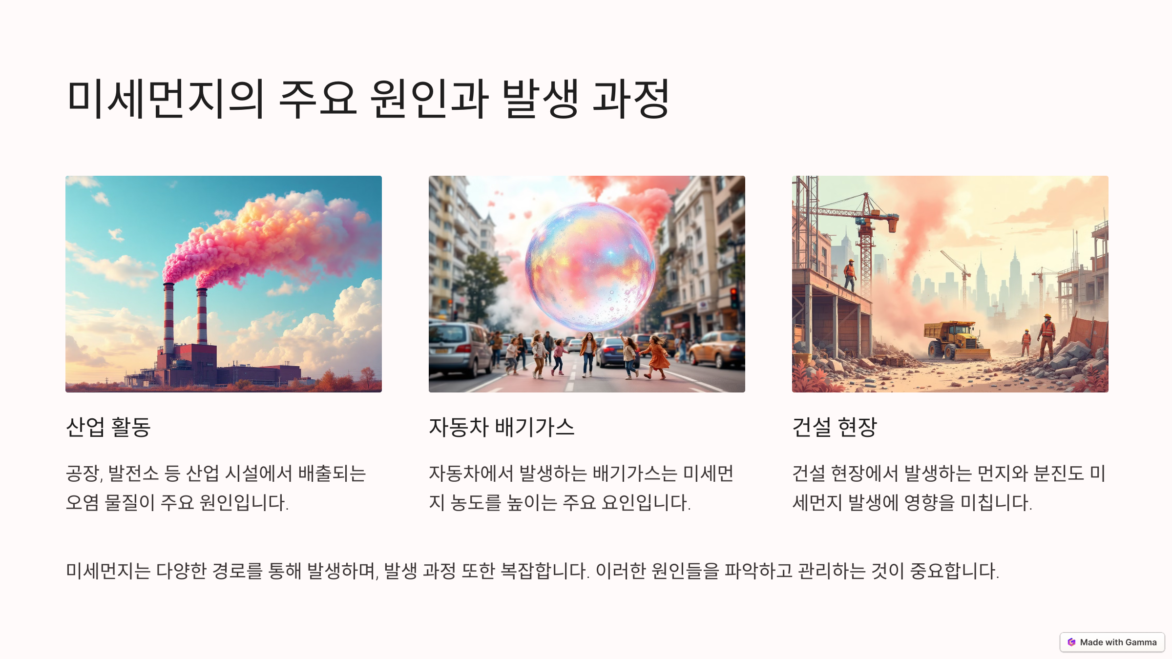 미세먼지는 자연적인 원인과 인위적인 원인에 의해 발생해요. 자연적인 원인으로는 황사, 화산 폭발, 해양 염분, 식물에서 나오는 꽃가루 등이 있으며, 이러한 요인은 계절과 지역에 따라 영향을 미칠 수 있어요. 특히 봄철 황사가 심한 지역에서는 미세먼지 농도가 급격히 높아질 수 있어요. 인위적인 원인은 주로 자동차 배기가스, 공장 매연, 건설 공사 등에서 발생하는데, 대도시에서는 교통량 증가와 산업 활동이 미세먼지 농도를 높이는 주요 요인이 되고 있어요. 특히 대기 정체가 심한 날에는 미세먼지가 쉽게 흩어지지 않아 농도가 급격히 증가할 수 있어 더욱 주의가 필요해요.
